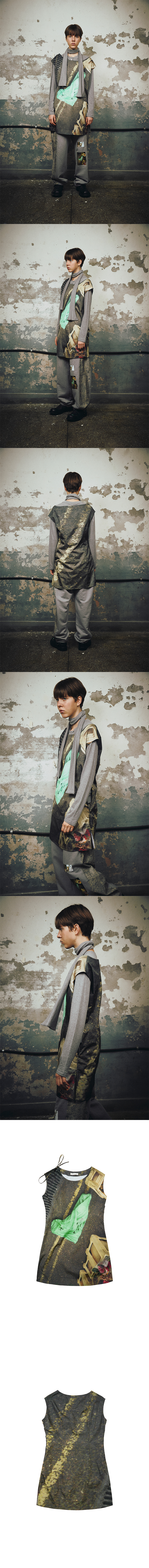 DETAIL - Photo printed throughout - Adjustable strap at neckline - Zip closure at side seam - Darts at waist - Windproof and water-repellent fabric COMPOSITION Polyester 100% SIZE MEASUREMENT - Size OS : Length 83cm_ Chest 49cm_ Shoulder 53cm (adjustable) Made in S o u t h Korea WASHING INSTRUCTIONS Dry clean recommended Hand wash cold Wash separately Do not bleach