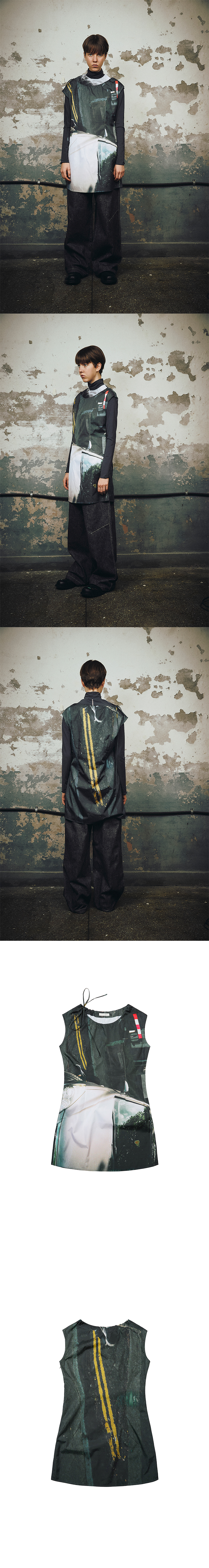 DETAIL - Photo printed throughout - Adjustable strap at neckline - Zip closure at side seam - Darts at waist - Windproof and water-repellent fabric COMPOSITION Polyester 100% SIZE MEASUREMENT - Size OS : Length 83cm_ Chest 49cm_ Shoulder 53cm (adjustable) Made in S o u t h Korea WASHING INSTRUCTIONS Dry clean recommended Hand wash cold Wash separately Do not bleach