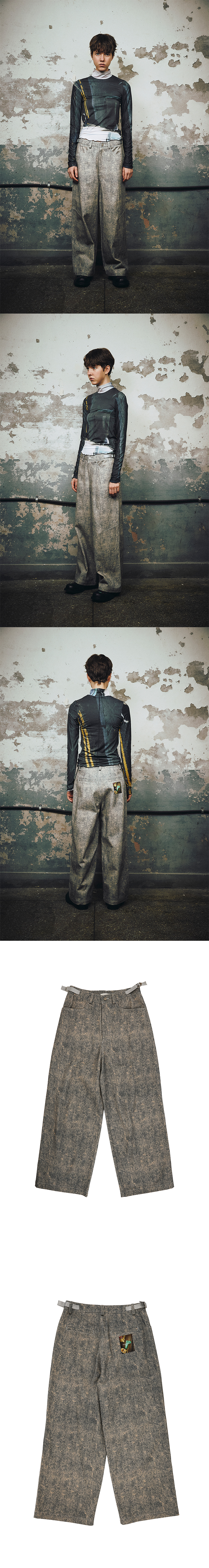 DETAIL - Adjustable cinch straps at waist - Darts at knee - Zip-fly - Belt loops - Two-Pocket styling - Wide fit - Photo label printed at back pocket - Graphic pattern printed throughout COMPOSITION Cotton 100% SIZE MEASUREMENT - Size S : Length 101cm_ Waist 37.5cm_ Rise 33cm_ Thigh 32cm_ Hem 30.5cm - Size M : Length 106cm_ Waist 41cm_ Rise 34cm_ Thigh 33cm_ Hem 31.5cm Made in S o u t h Korea WASHING INSTRUCTIONS Dry clean recommended Hand wash cold Wash separately Do not bleach