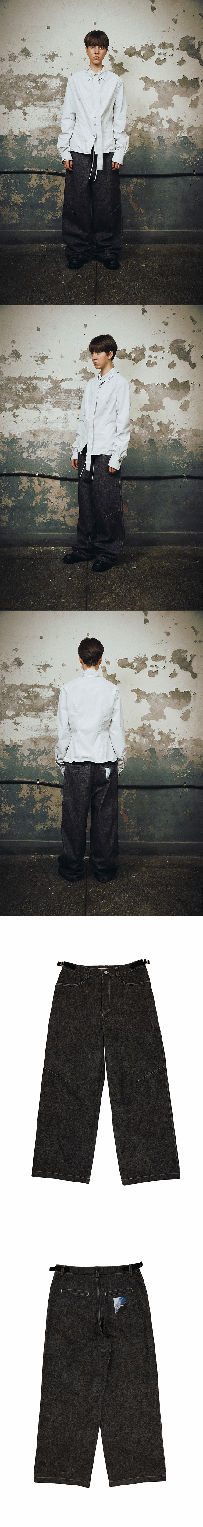 DETAIL - Adjustable cinch straps at waist - Darts at knee - Zip-fly - Belt loops - Two-Pocket styling - Wide fit - Photo label printed at back pocket - Graphic pattern printed throughout COMPOSITION Cotton 100% SIZE MEASUREMENT - Size S : Length 101cm_ Waist 37.5cm_ Rise 33cm_ Thigh 32cm_ Hem 30.5cm - Size M : Length 106cm_ Waist 41cm_ Rise 34cm_ Thigh 33cm_ Hem 31.5cm Made in S o u t h Korea WASHING INSTRUCTIONS Dry clean recommended Hand wash cold Wash separately Do not bleach