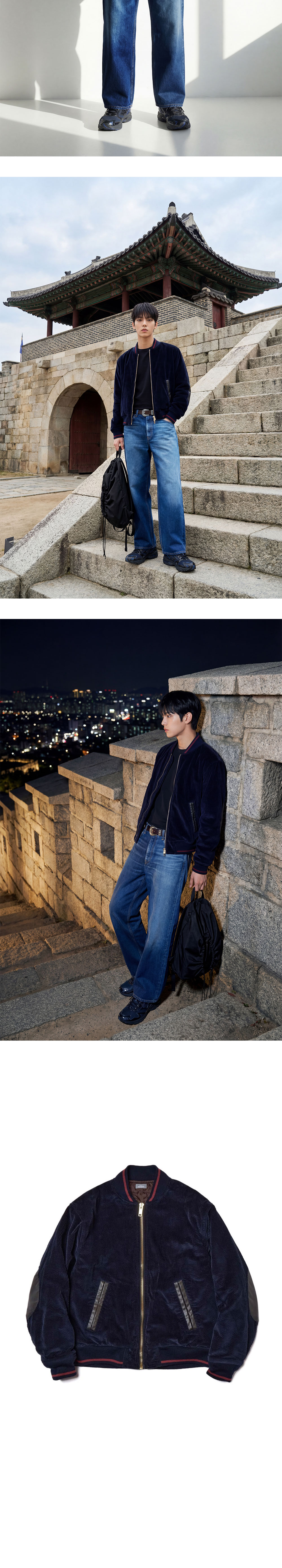 클래식한 소재에 다양한 텍스처를 더해 완성한 Kolor Beacon 25WBM-G05134 네이비 아우터입니다. - 가죽 트리밍 디테일 - 보머 재킷 실루엣 - 와인 스트라이프 리브 포인트 ✧ AI로 제작한 콘텐츠가 포함되었습니다.