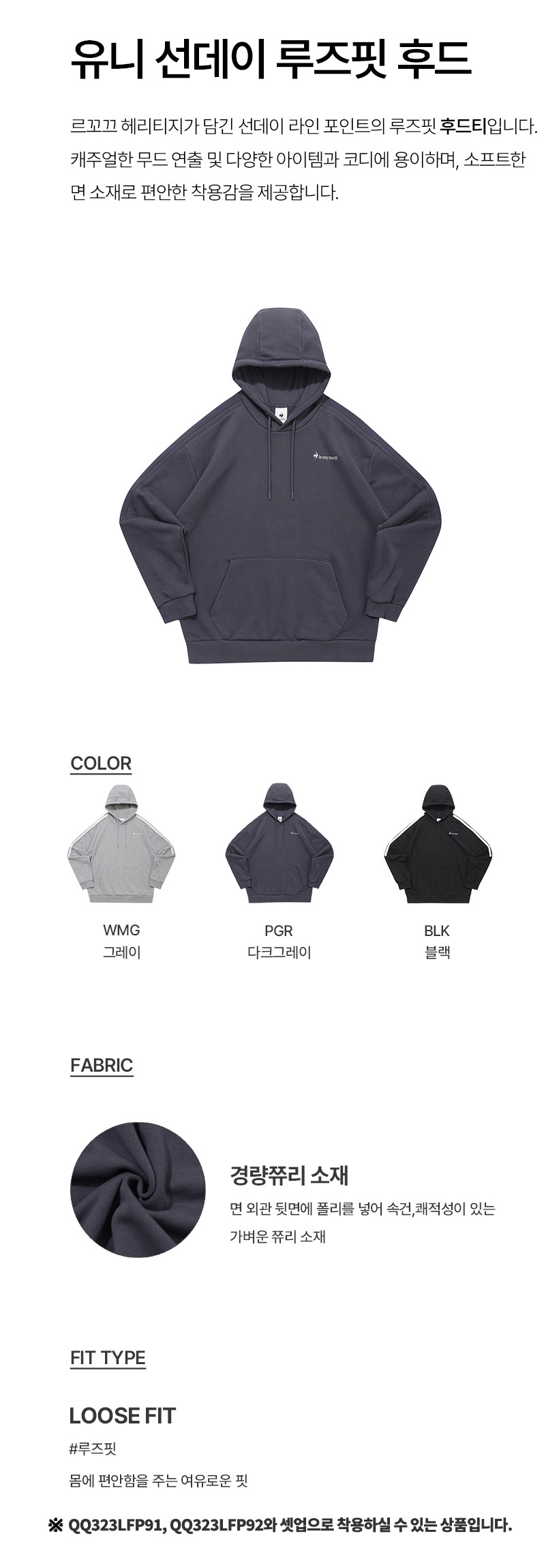 르꼬끄 스포르티브 유니 선데이 루즈핏 후드 - 다크그레이(QQ323LHD92)