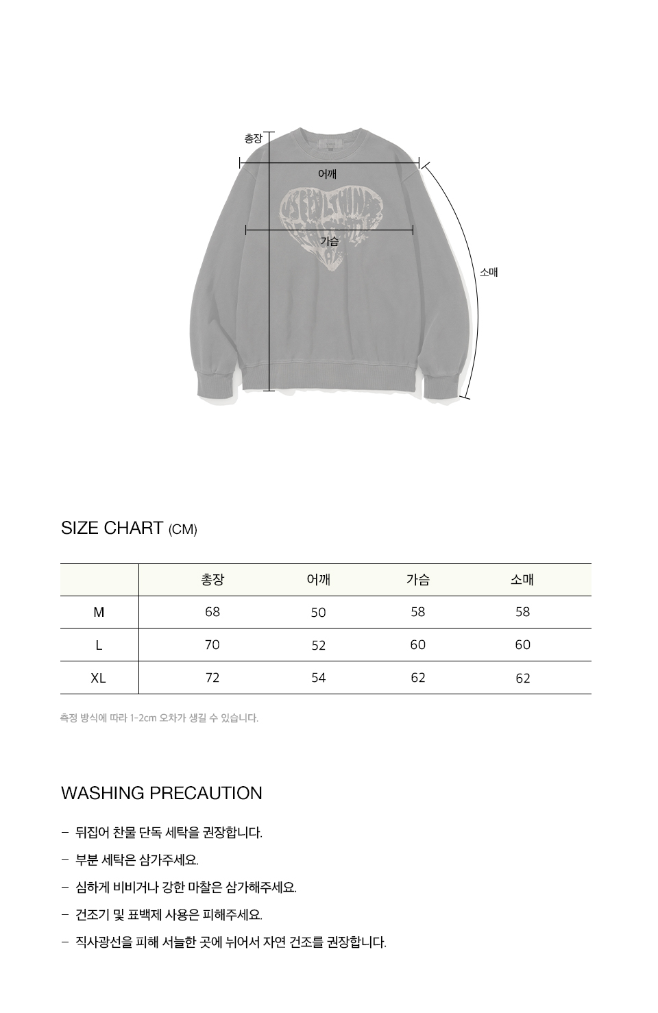 코튼 폴리 혼방 원단으로 편안한 착용감의 맨투맨입니다. 빈티지한 하트 그래픽을 전면에 배치하여 포인트를 주었고 넥 라인과 소매, 밑단은 견고한 립으로 마감하여 내구성을 높였습니다. 천연색소를 사용하여 섬유에 고온 고압을 가해 색감을 입히는 피그먼트 워싱 가공으로 완성된 특유의 색감으로 유니크한 무드를 더해주며 오버핏으로 제작되어 착용 시 멋스러운 실루엣을 연출해 줍니다. * 피그먼트 워싱 가공 특성상 물 빠짐 및 이염이 발생할 수 있으므로, 부분 세탁은 삼가주시고 반드시 찬물 단독 세탁해 주시기 바랍니다.