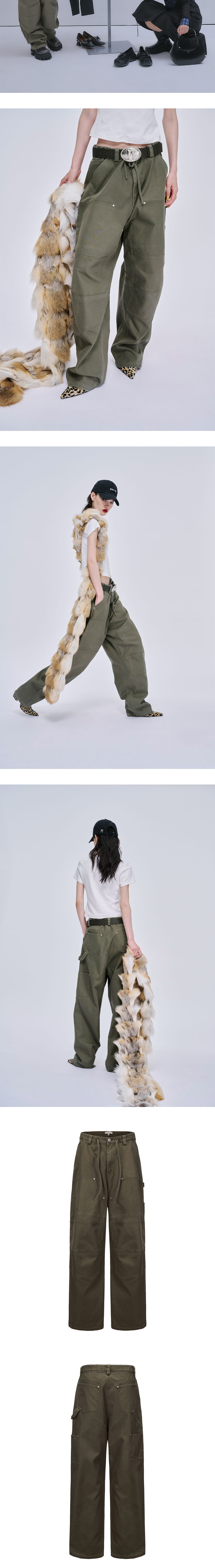 워크웨어 무드와 실용적인 디테일이 돋보이는 마크공 우먼 카고 팬츠 그린입니다. - 다크 카키 컬러의 와이드 핏 팬츠 - 전체적으로 루즈한 실루엣으로 편안한 착용감 제공 - 허리 스트링 디테일로 사이즈 조절 가능 - 스티치 라인과 절개 디테일로 입체감 있는 디자인 - 사이드와 다리에 포켓이 배치되어 실용성 강화 - 워크웨어 무드가 느껴지는 카고 스타일 팬츠 - 캐주얼부터 스트리트룩까지 다양한 코디에 활용 가능