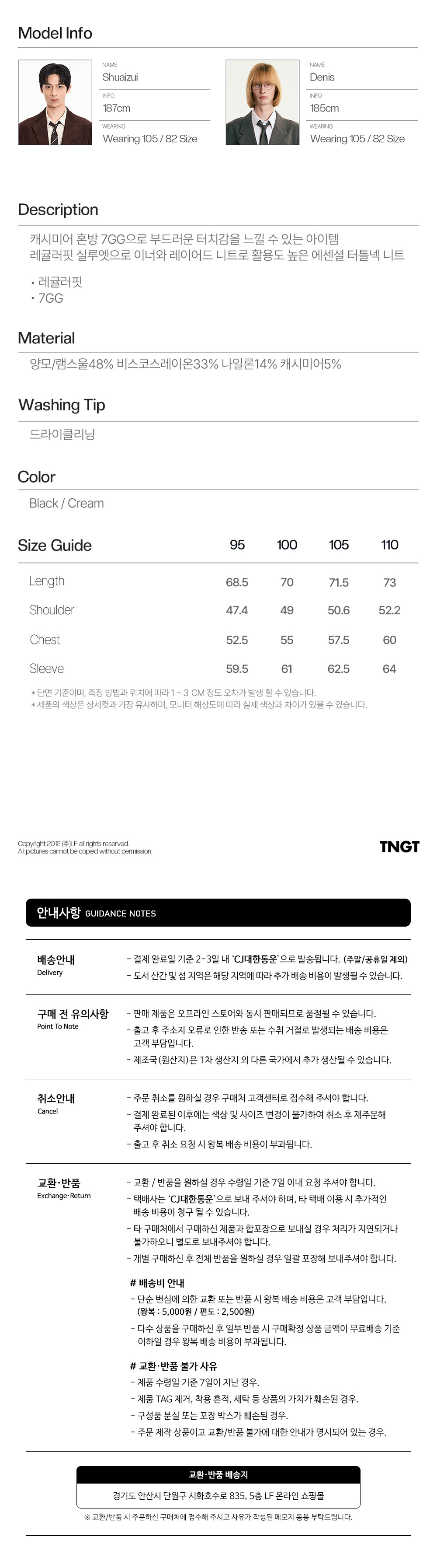 티엔지티 캐시미어 터틀넥 니트 탑 블랙