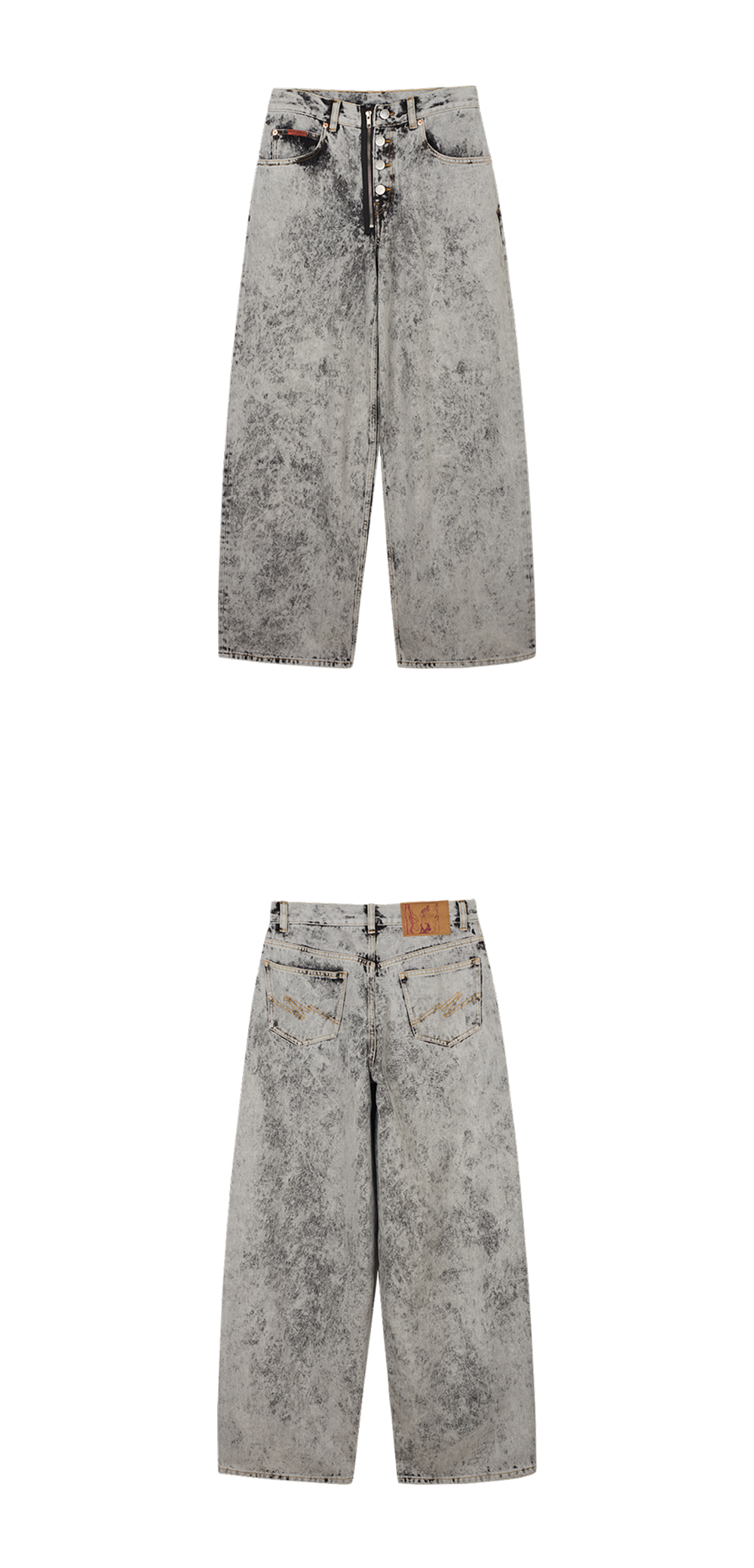 마틴 로즈 집 헴 진 그레이 애시드 워시입니다. - 애시드 워싱 처리된 그레이 데님 팬츠 - 빈티지한 질감과 와이드 실루엣 - 버튼 플라이 여밈과 지퍼 디테일 - 사이드·코인·백 포켓 포함한 5포켓 디자인 - 코인 포켓 라벨 및 레더 패치 포인트