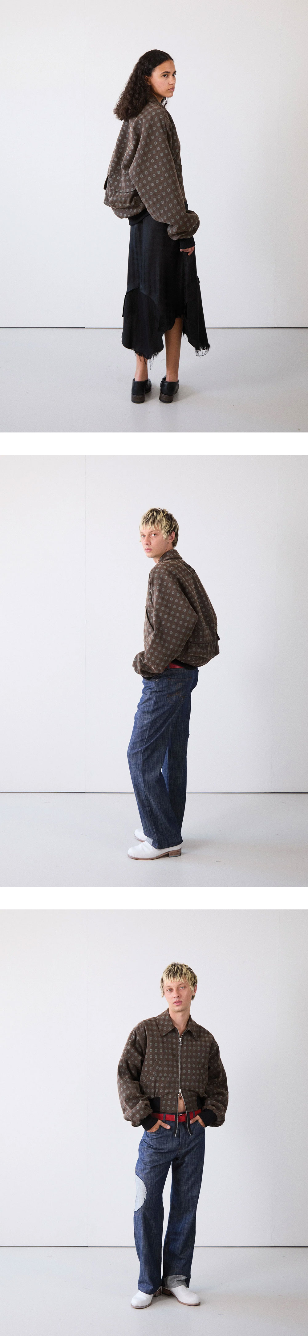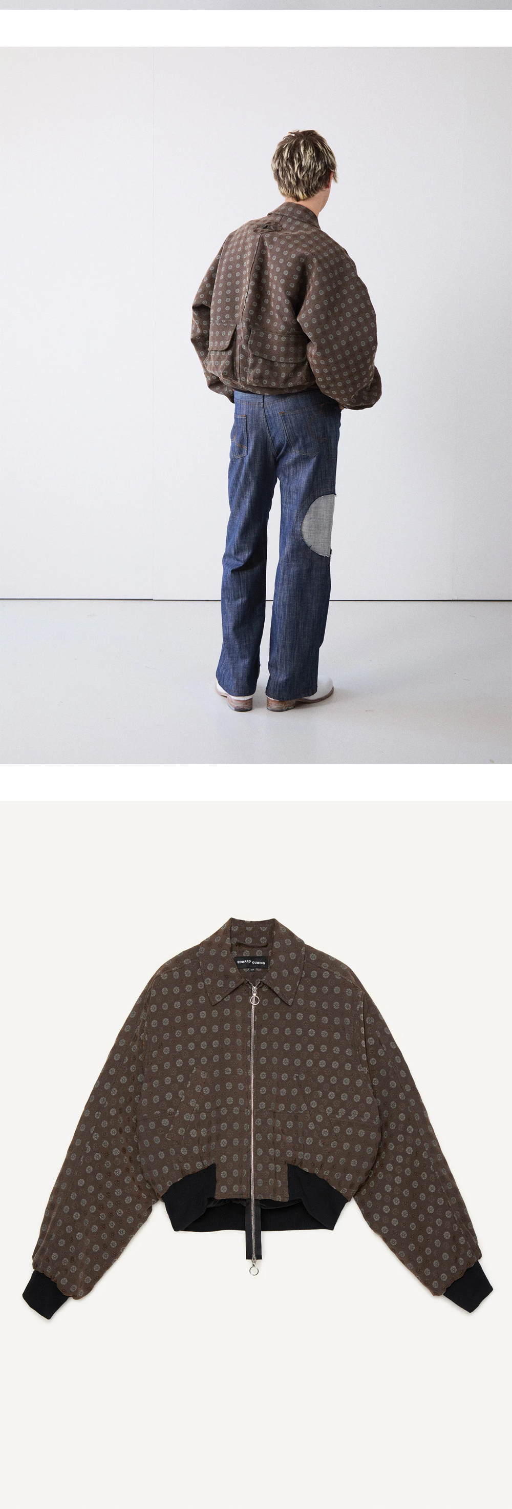 이탈리안 자카드 무늬가 매력적인 에드워드 커밍 우먼 바텀 헤비 봄버 브라운입니다. - 패딩 처리된 안감이 있는 이탈리안 자카드 소재 봄버 재킷 - 하단이 넓은 실루엣과 곡선형 밑단 - 뒷면에는 조형적인 포켓 - 더블 엔디드 Riri 지퍼와 시보리(골지) 커프스, 밑단으로 마무리 되었음