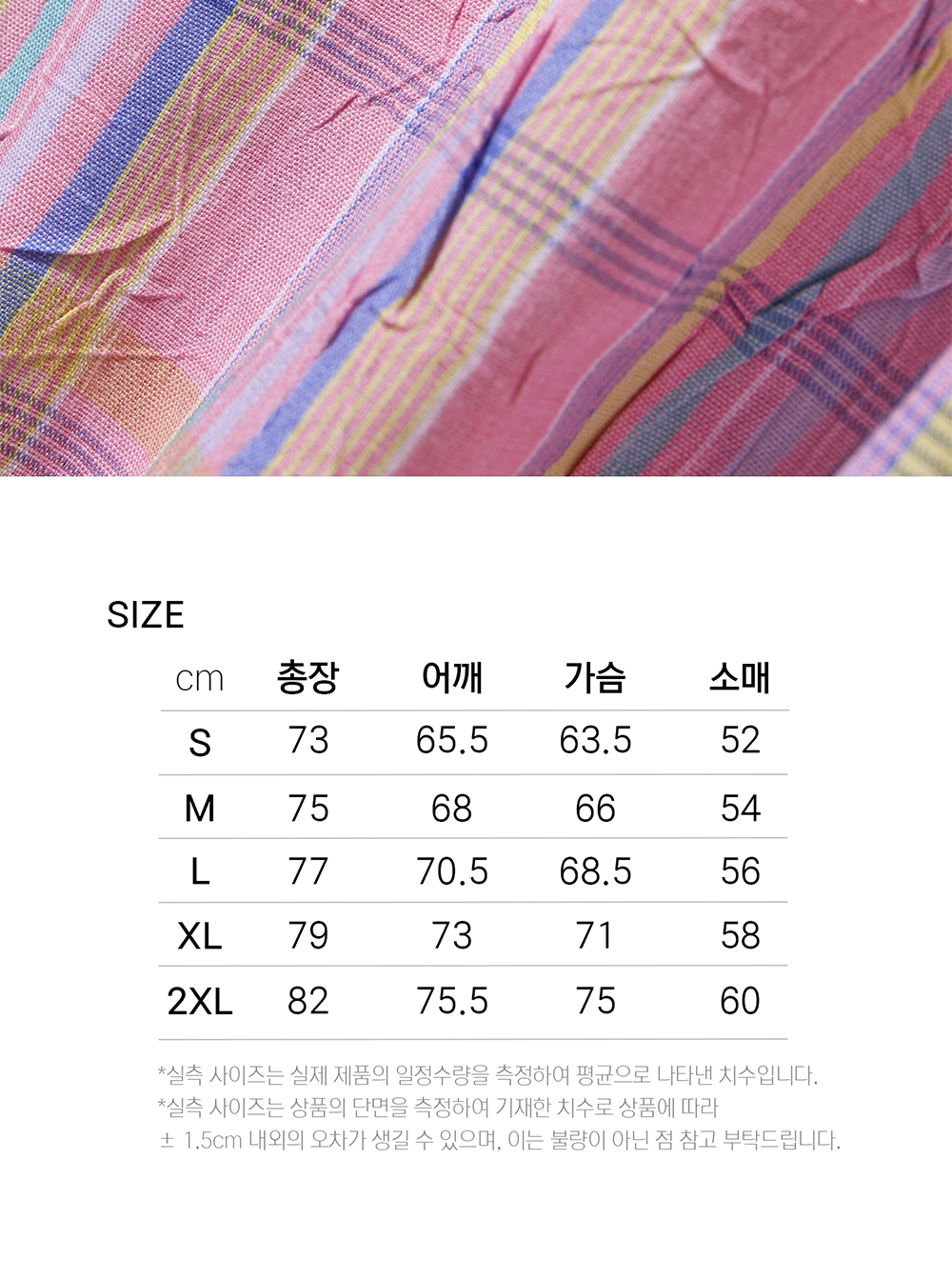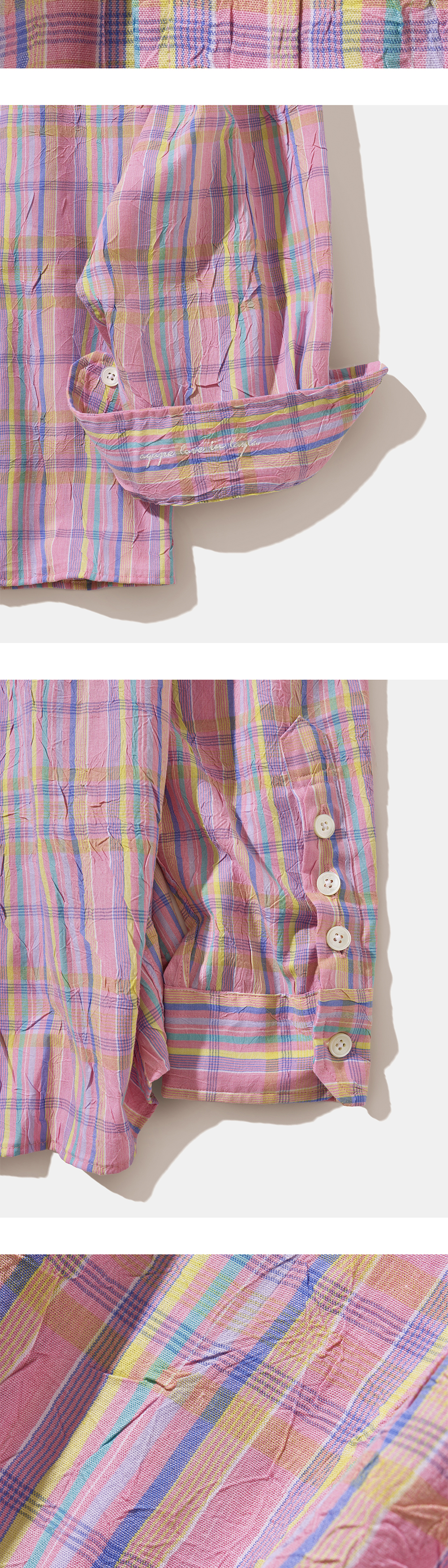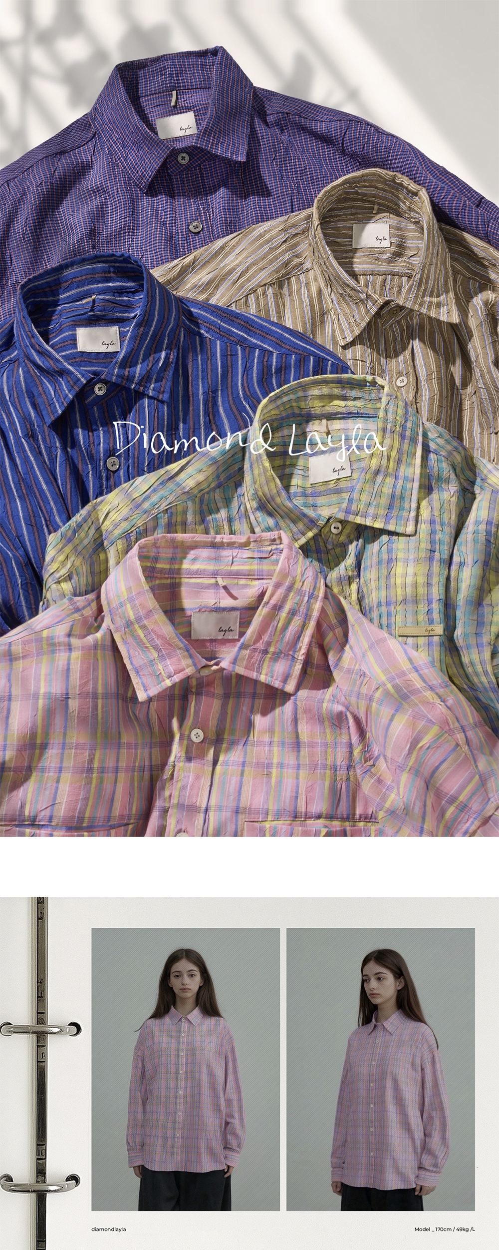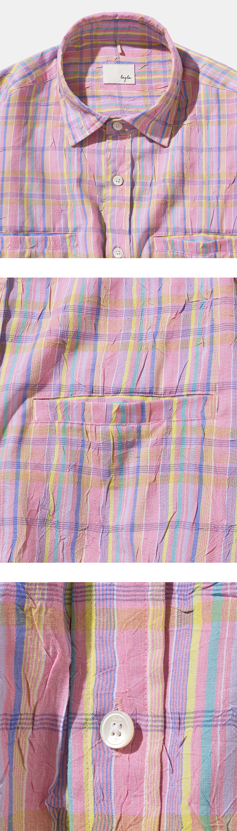 - Fit : Big Over-fit - Material : Cotton 100% - Season : Four seasons - Washing method : Separate cold wash, Do not Bleach, Do not tumble dry, Iron with low heat coverd by cloth - Made in KOREA - 솜사탕처럼 몽환적인 파스텔 컬러들이 교차하는 페어리 플로스 체크 원단 - 화사하면서도 부드러운 발색으로 경쾌하고 가벼운 무드를 연출 - 카라,커프스에 심지 부착으로 내구성 겸비 및 뒤틀림 방지 - 입술 포켓 디자인 적용으로 심미성과 실용성을 강화 - 빅 오버핏으로 편안하면서도 스타일리시한 실루엣 - 레이라 시그니처 agape love in layla 커프스 히든 자수 - 고급스러운 Layla 0613 각인 천연 자개 단추