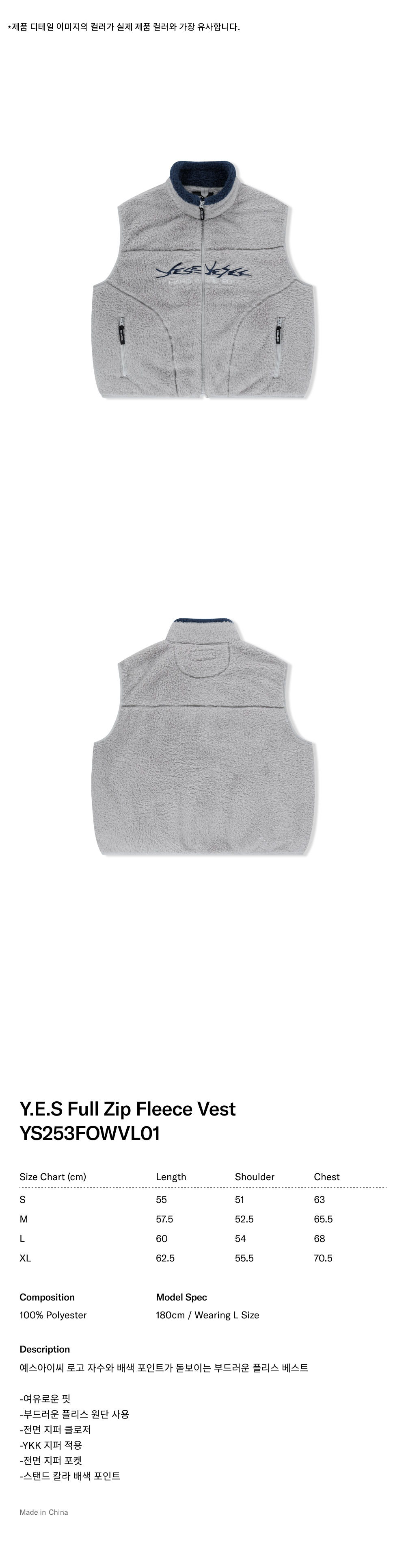 예스아이씨 예스 풀 집 플리스 베스트 그레이