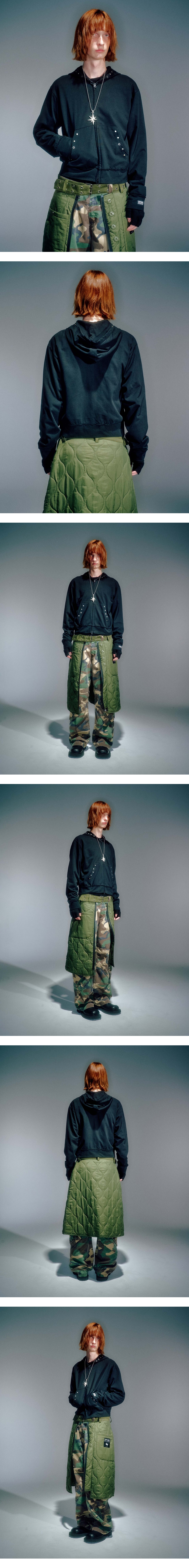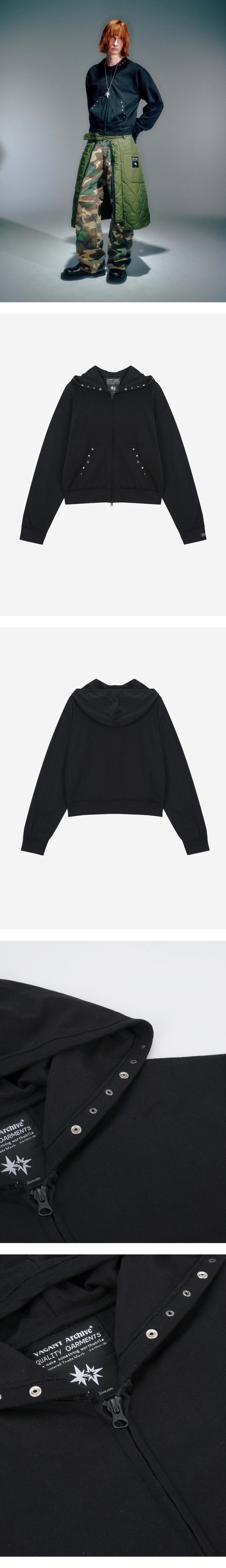 크롭한 기장의 캐주얼한 무드의 후드 집업 싱글 원단 사용으로 가벼운 아웃웨어부터 이너웨어까지 활용 후드/주머니 라인따라 배치된 메탈 스터드 장식 포인트 소매/밑단 홀겹 재봉하여 빈티지한 디테일 연출 M/L (CM) Lenght : 60.5 / 62.5 Shoulder : 51.5 / 53.5 Bust : 54 / 56 Sleeve : 68.5 / 69.5
