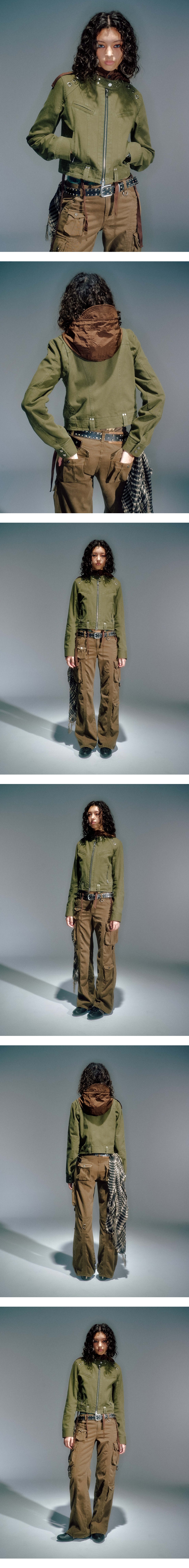 어깨 부분 아일렛 디테일 전면부 지퍼 포켓 디테일 바이오 워싱하여 빈티지한 무드 연출 YKK 2WAY 지퍼 사용 S/M (CM) Length : 49.5 / 51.5 Shoulder : 40 / 42 Bust : 47 / 49 Sleeve : 64.5 / 65