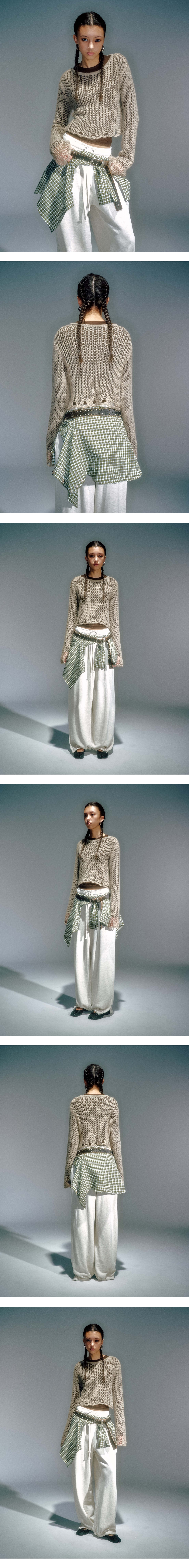 네트 조직감과 골지 소재 믹스한 레이어드 탑 키드모 울 사용으로 빈티지한 무드의 조직 연출 언발란스한 기장감 분리된 탑으로 착용 가능 S (CM) Length : 53.5 Shoulder : 45 Bust : 47 Sleeve : 70