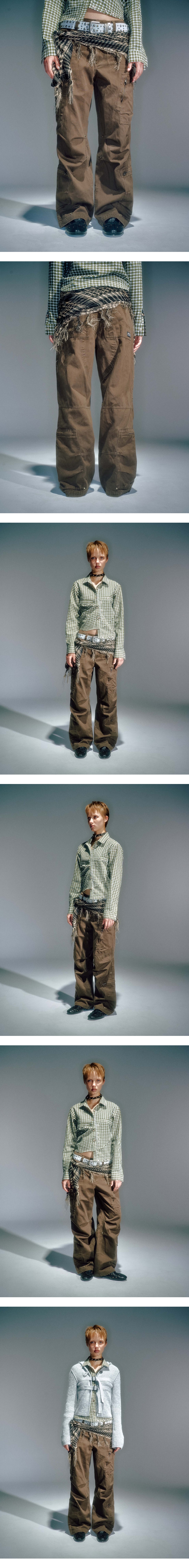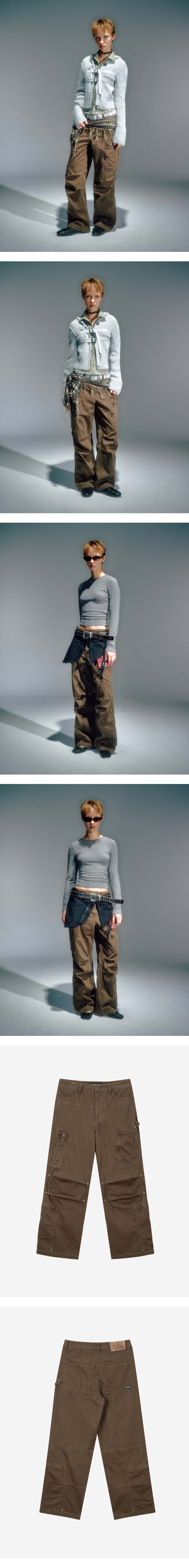 YKK 지퍼 사용 밀리터리 칼집 포켓 디테일과 워크웨어 포켓 디테일을 비대칭하게 배치 양쪽 밑단 포켓 사용으로 수납공간 확보 가먼츠 워싱으로 빈티지한 컬러감 구현 무릎 턱 디테일로 인한 입체적인 실루엣 베이컨트 제작 리벳 사용 S/M(CM) Length : 101 / 102 Waist : 38 / 40 Hip : 48.5 / 50.5 Thigh : 32 / 33 Front Rise : 31 / 32 Hem : 25 / 26