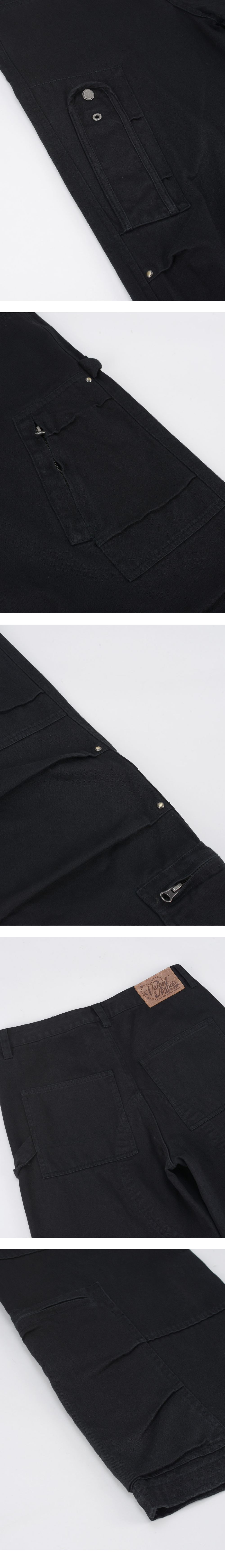 YKK 지퍼 사용 밀리터리 칼집 포켓 디테일과 워크웨어 포켓 디테일을 비대칭하게 배치 양쪽 밑단 포켓 사용으로 수납공간 확보 가먼츠 워싱으로 빈티지한 컬러감 구현 무릎 턱 디테일로 인한 입체적인 실루엣 베이컨트 제작 리벳 사용 S/M(CM) Length : 101 / 102 Waist : 38 / 40 Hip : 48.5 / 50.5 Thigh : 32 / 33 Front Rise : 31 / 32 Hem : 25 / 26