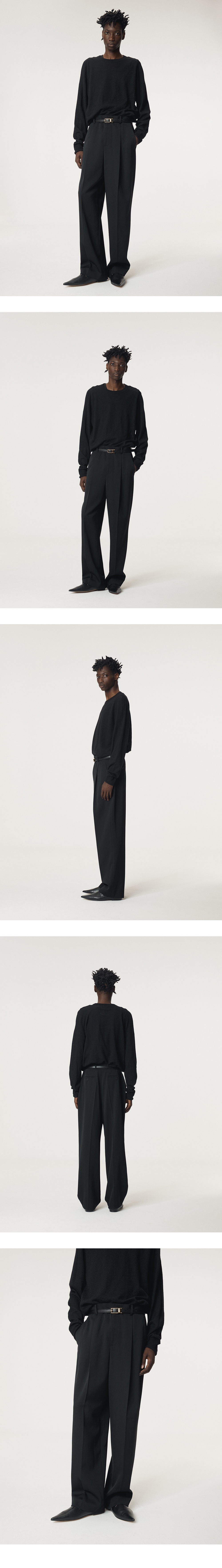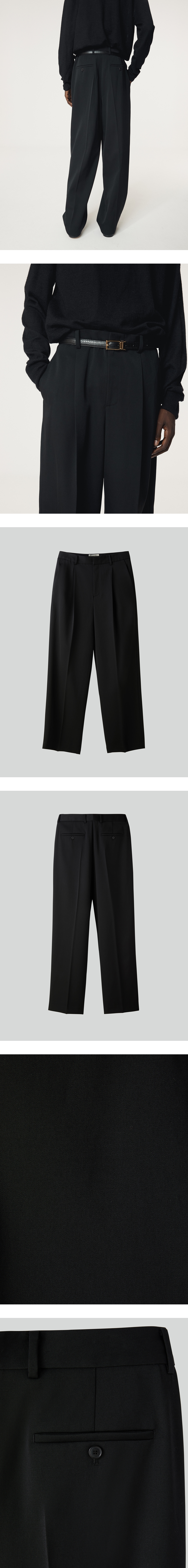 - 고밀도 울 소재, 구조적인 턱 디테일 팬츠 실루엣 - 앞뒤 프레스 디테일로 단정한 라인 연출 - 뒤 포켓 소뿔단추 디테일로 클래식한 포인트 강조 - FABRIC MADE IN JAPAN