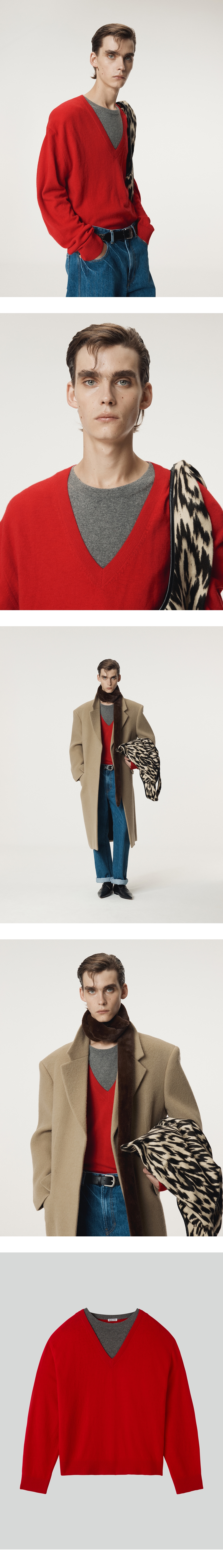 - 클래식 핏으로 단정하고 균형 잡힌 실루엣 연출 - 배색 라운드넥 디테일이 돋보이는 V넥 디자인 - 울·캐시미어 혼방으로 완성해 부드럽고 편안한 착용감