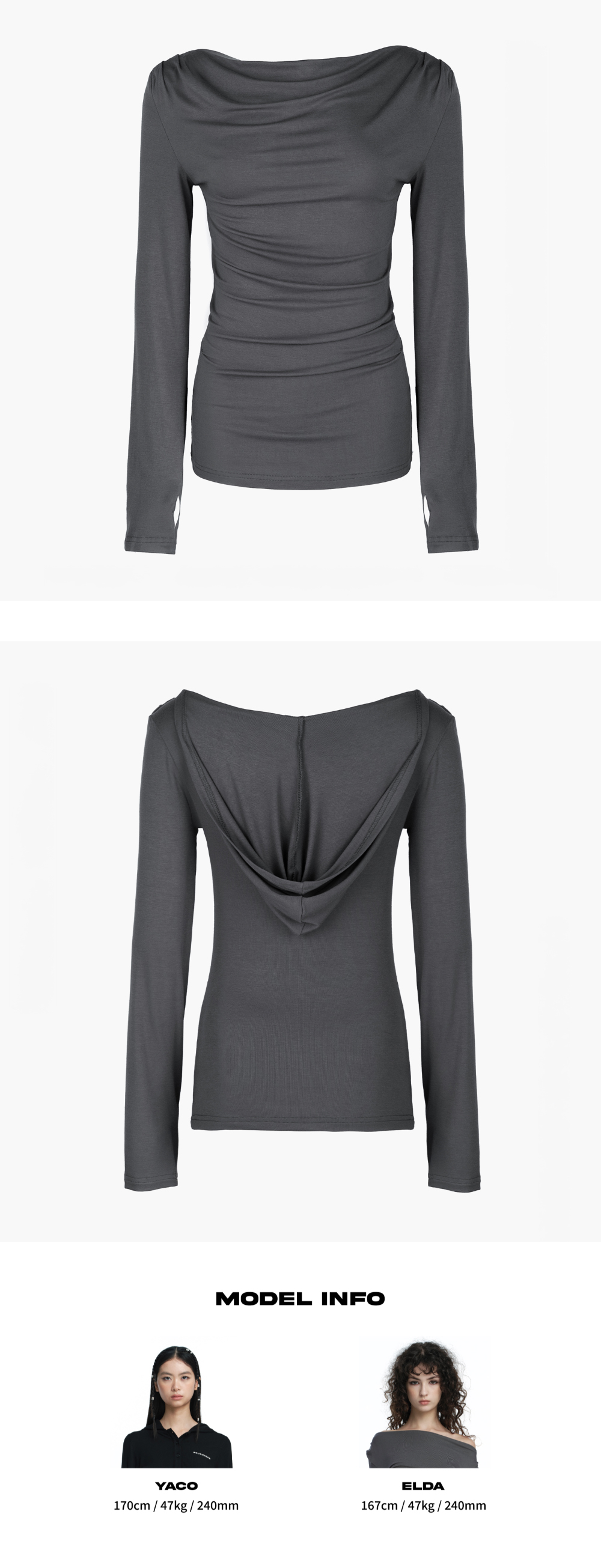 촉촉하고 부드러운 텍스처의 원단으로 제작되어, 피부에 닿는 순간 매끄럽고 가벼운 착용감을 선사합니다. 뛰어난 신축성과 편안한 활동성을 제공하며, 자연스럽게 흘러내리는 드레이프 라인이 돋보입니다. 오프숄더로도 연출할 수 있고, 후드 디테일이 더해져 다양한 실루엣을 완성할 수 있습니다. Model size : YACO 170cm 47kg / ELDA 167cm 47kg Fitting size : FREE Material : Rayon 92% / Polyester 8%