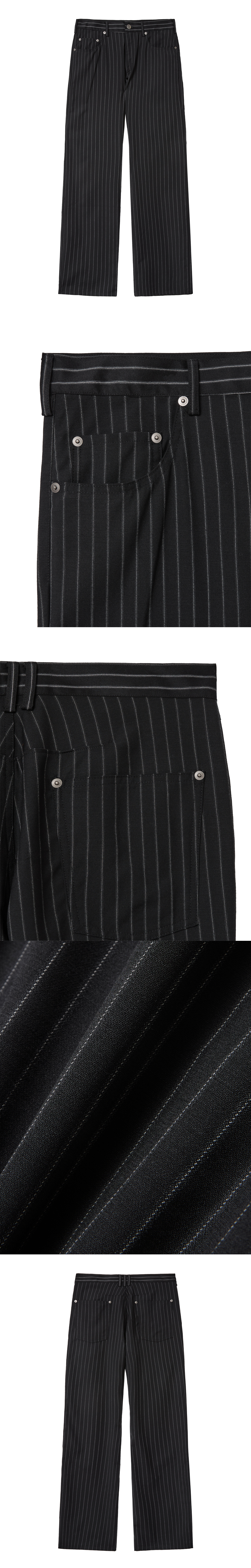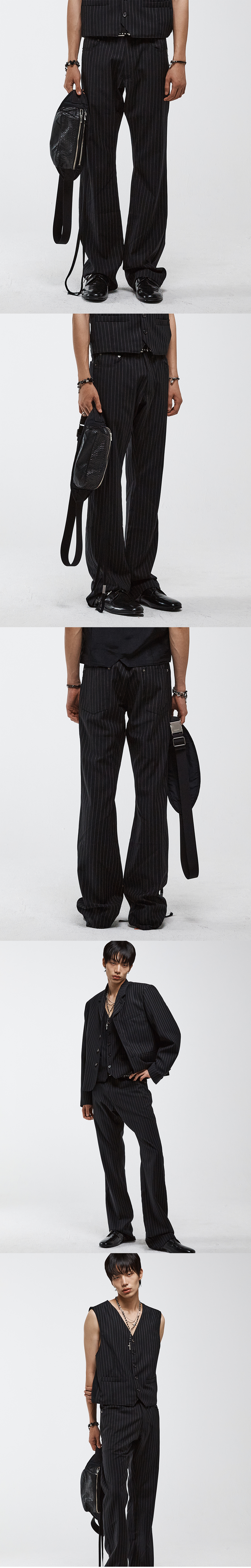 클래식한 울 핀스트라이프 팬츠를 기반으로 제작된 부츠컷 팬츠입니다. 슬림하게 떨어지는 실루엣에 부츠컷 라인을 결합해 다리 라인을 따라 자연스럽게 퍼지는 실루엣이 세련된 무드를 연출합니다. 핀스트라이프 패턴의 직선적인 흐름이 레그라인을 따라 이어지며 모던한 인상을 완성합니다. -DETAIL- 울 핀스트라이프 원단 부츠컷 실루엣 5포켓 디자인 리벳 디테일