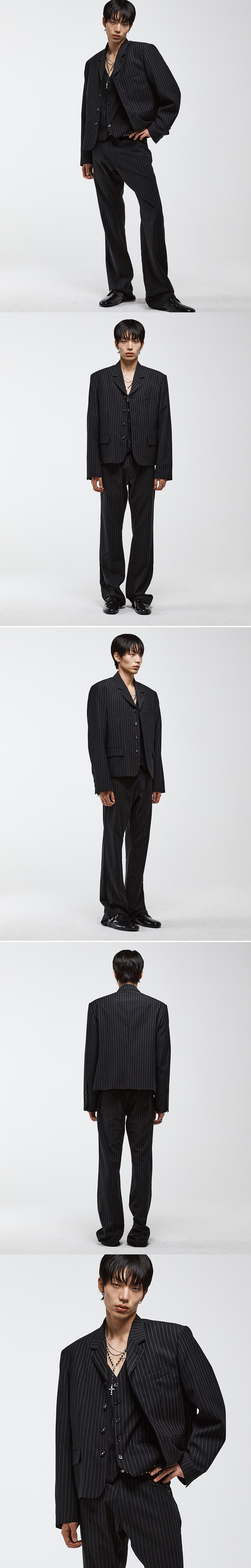 울 핀스트라이프 원단으로 제작된 4버튼 크롭 블레이저입니다. 라펠 내부의 단추 여밈을 사용하여 두 가지 방식으로 연출이 가능하도록 디자인되었습니다. 전면에는 자체 개발한 6구 단추를 사용해 시그니처 H-스티치 디테일을 더했으며, 커프스에는 변형된 버튼 구성을 적용해 위트 있는 포인트를 주었습니다. 핀스트라이프 패턴과 크롭 기장이 결합되어 아카이브적인 무드와 현대적인 실루엣을 동시에 보여줍니다. -DETAIL- 울 핀스트라이프 원단 4버튼 크롭 기장 라펠 내부 단추 여밈 자체 개발 6구 버튼 & H-스티치 디테일 소매 리얼 버튼 천연 소뿔 단추