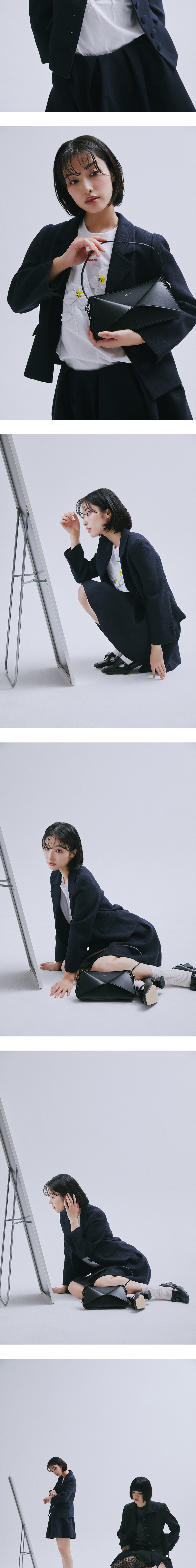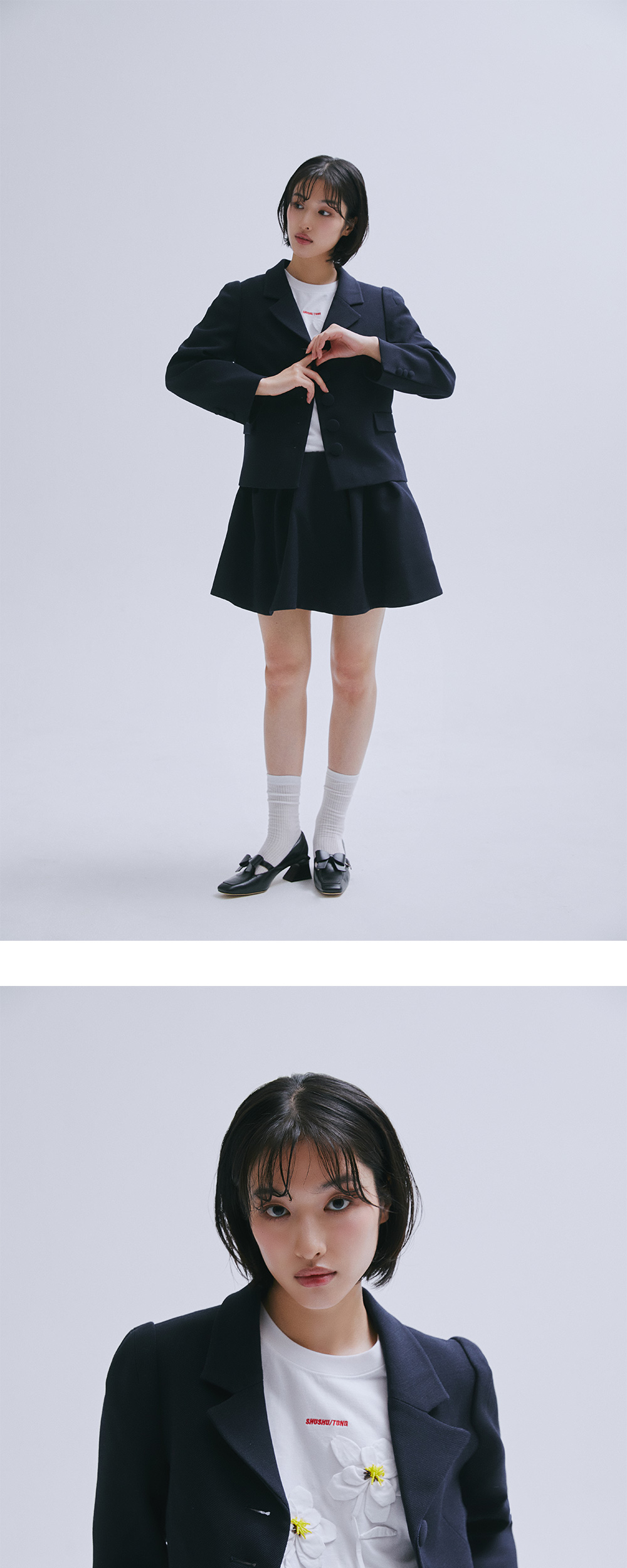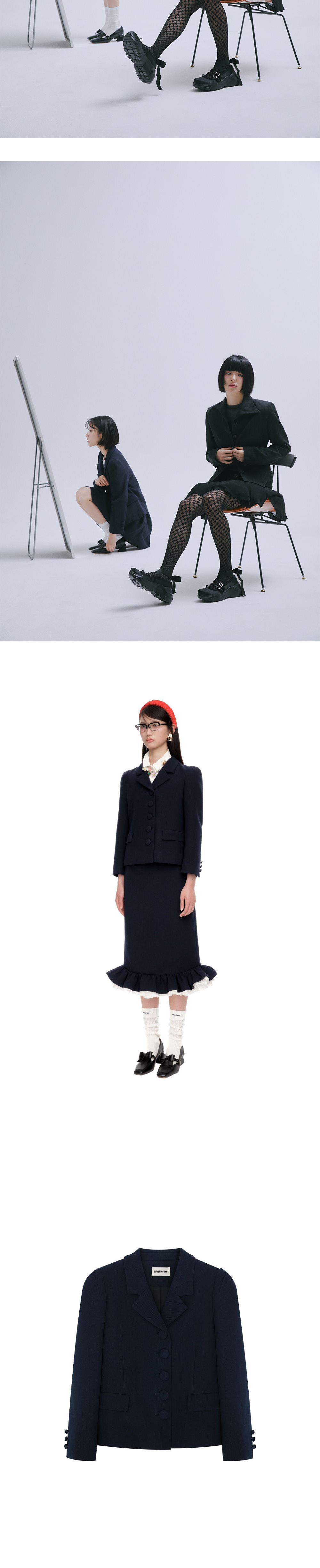 절제된 실루엣 속에 여성의 힘을 담아낸 슈슈통 우먼 라펠 숏 자켓 네이비 블루입니다. - 노치드 라펠 디자인 - 구조적인 어깨 라인 - 원단 커버 버튼 디테일 - 크리스피한 촉감의 울 소재