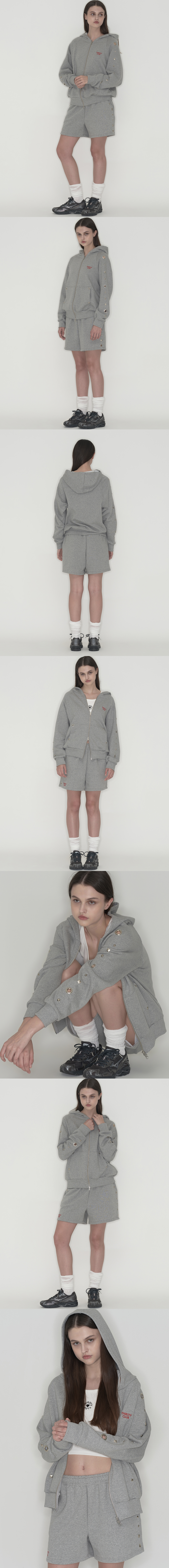 사이드 아일렛 + 스터드 조화로 유니크한 포인트 (별, 스퀘어, 아일렛, 스터드 등) 베이직한 스웻팬츠 원단감의 스타일리시한 세미루즈핏 원앤온리 사이드 디테일로 소장가치 있는 아이템 후드와 숏팬츠의 구성으로 스포티하고 베이직한 아웃핏 연출 퀄리티 있는 컬러 자수