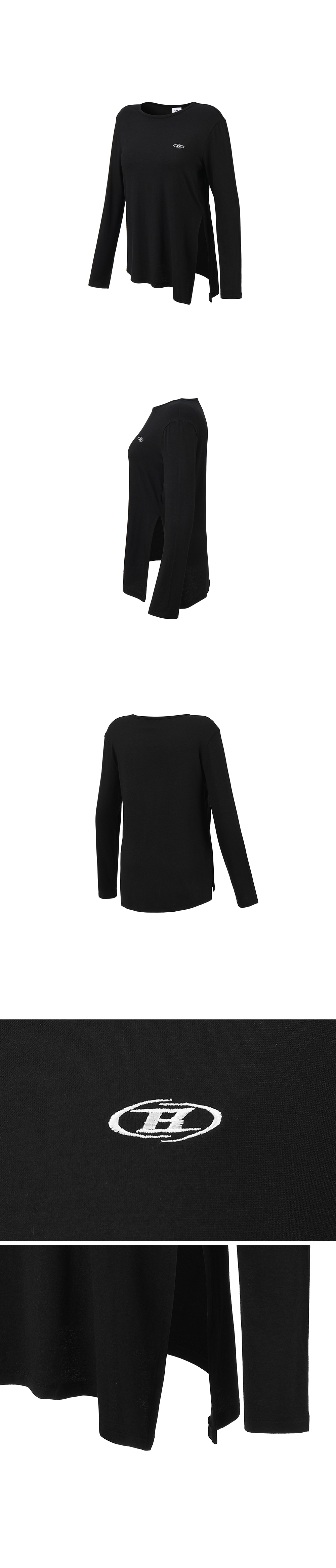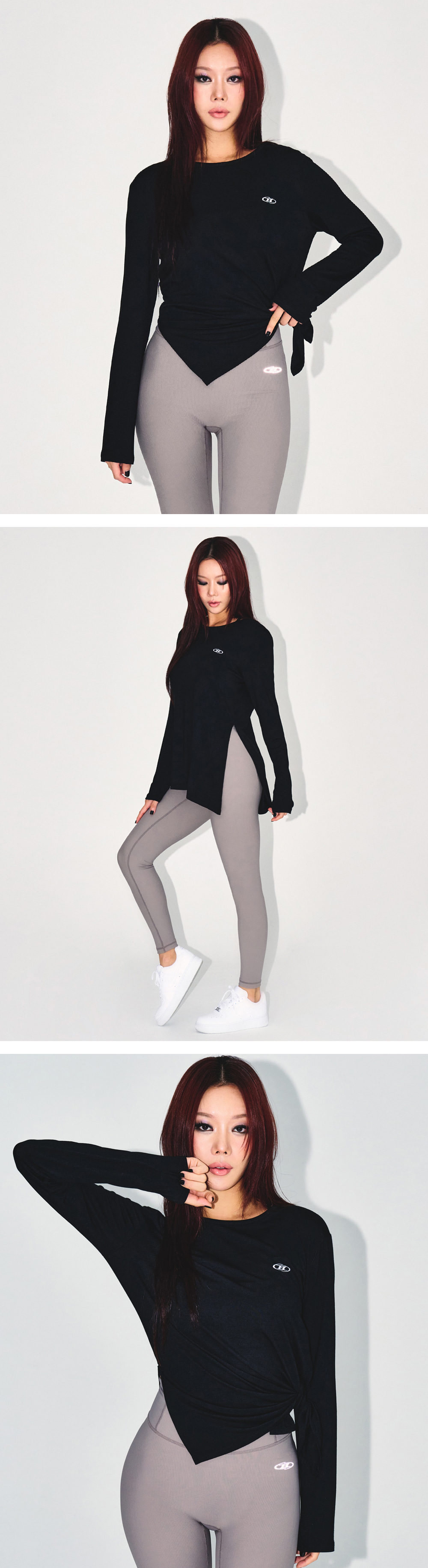 [DETAILS] * W 모달 타이 롱슬리브 - 신축성 좋은 모달스판 원단 - 사이드 사선 슬릿 디자인 - B 로고 포인트 Material : Modal 94%, Polyurethane 6% Fitting : DB 1 Size, 171cm, 57kg