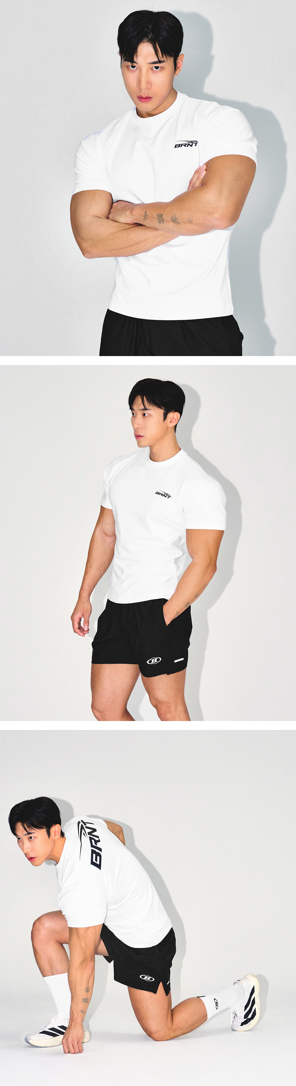 [DETAILS] * BRNT 백 로고 머슬 핏 티셔츠 - 탄성 있는 코튼 혼방 원단 - BRNT 로고 포인트 - 잦은 세탁에도 늘어남 없는 어깨 모빌론 테이핑 - 머슬핏 Material : Cotton 95%, Polyurethane 5% Fitting : HJ 4 Size, 180cm, 90kg / MK 4 Size, 181cm, 71kg