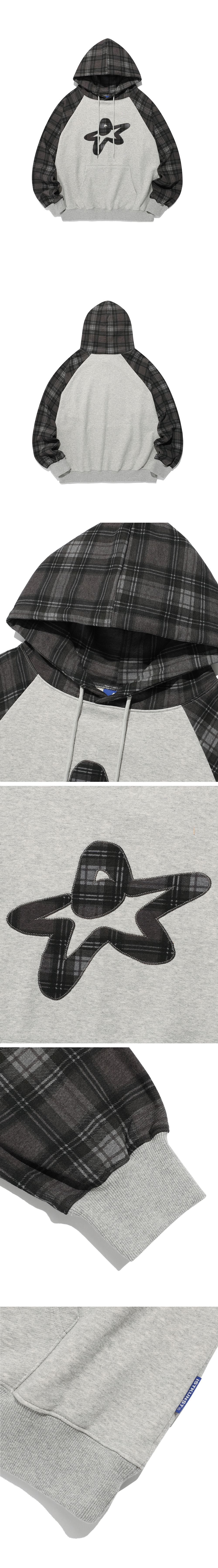 이스트쿤스트 스타 로고 체크 래글런 후디 그레이