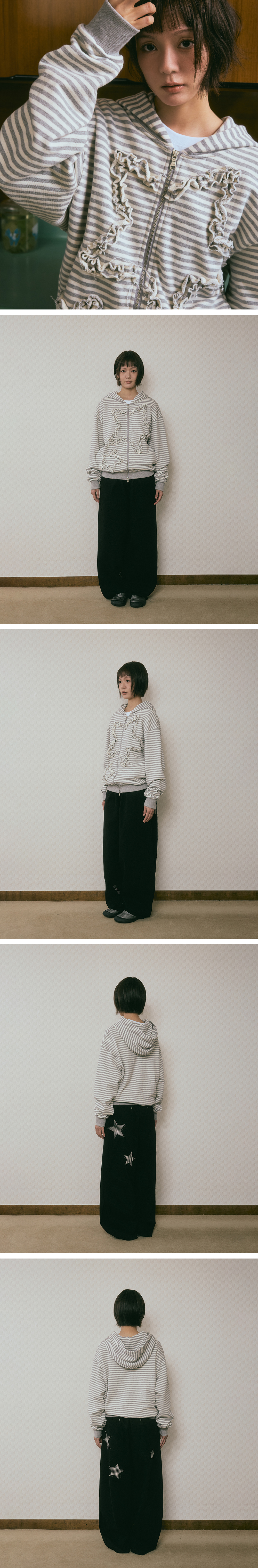 단델 스타 러플 스트라이프 후디 집업 아이보리