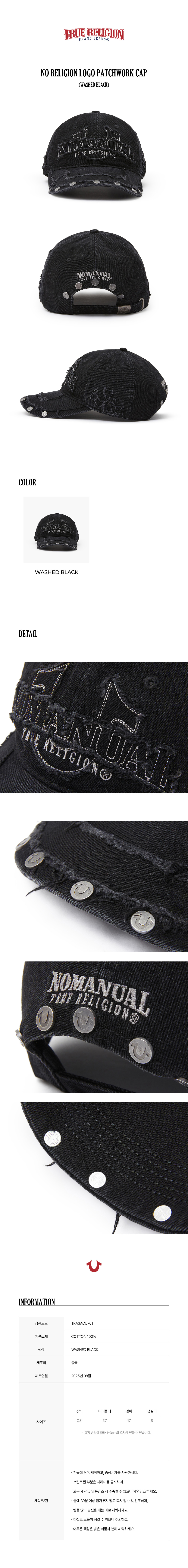 트루릴리젼 x 노매뉴얼 노 릴리젼 로고 패치 워크 캡 워시드 블랙