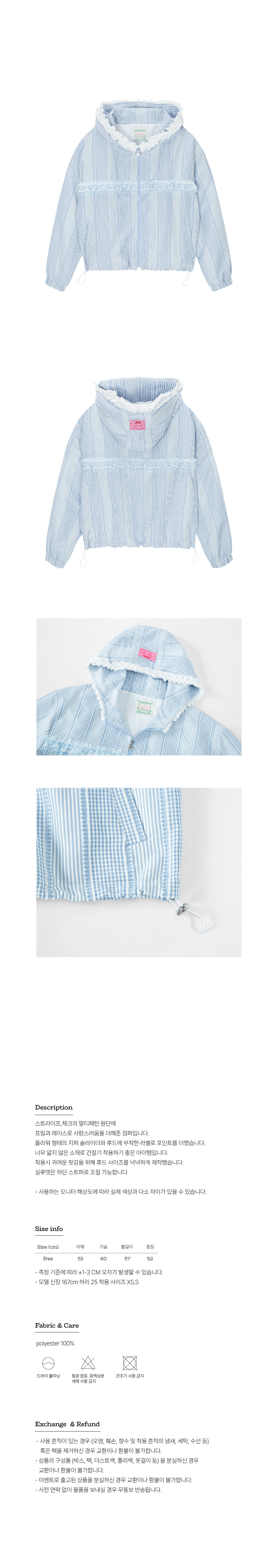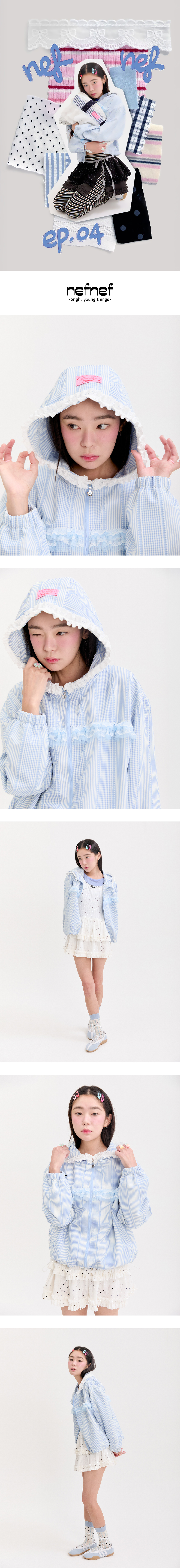 스트라이프,체크의 멀티패턴 원단에 프릴과 레이스로 사랑스러움을 더해준 점퍼입니다. 플라워 형태의 지퍼 슬라이더와 후드에 부착한 라벨로 포인트를 더했습니다. 너무 얇지 않은 소재로 간절기 착용하기 좋은 아이템입니다. 착용시 귀여운 핏감을 위해 후드 사이즈를 넉넉하게 제작했습니다. 실루엣은 하단 스토퍼로 조절 가능합니다.