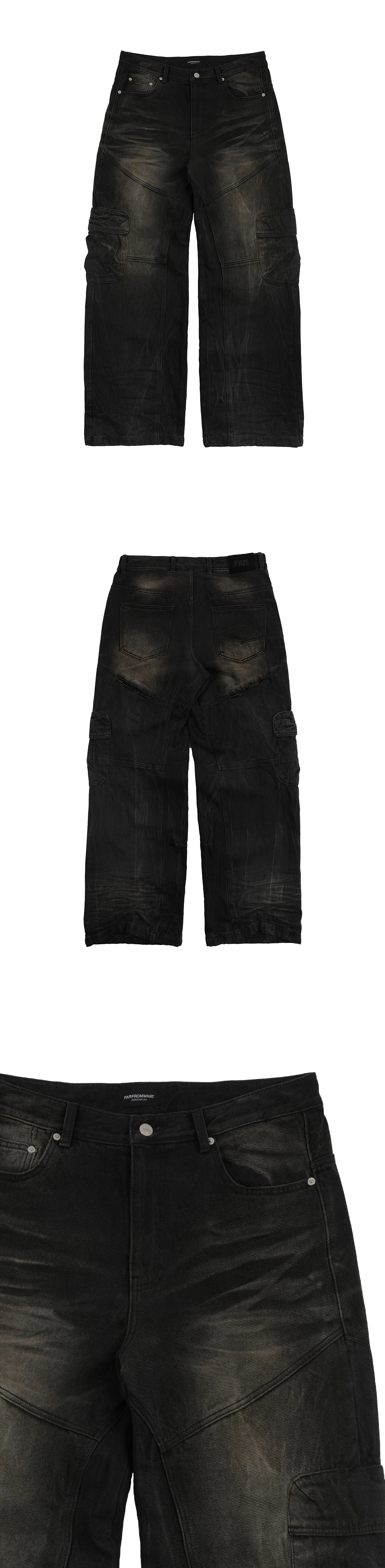묵직한 블랙 워싱이 매력적인 와이드 카고 데님입니다. 전면으로 흐르는 페이드와 입체 절개가 다리 라인을 강조하고, 무릎 3D 패널과 측면 카고 포켓이 유틸리티 무드를 완성합니다. 여유로운 힙·허벅지와 롱 인심이 만들어내는 풍부한 스택 실루엣이 가장 큰 포인트. 두꺼운 데님, 리벳·더블 스티치로 내구성을 높였으며, 미드라이즈 착용감과 깊은 포켓 구성으로 일상에서 편하고 실용적입니다.