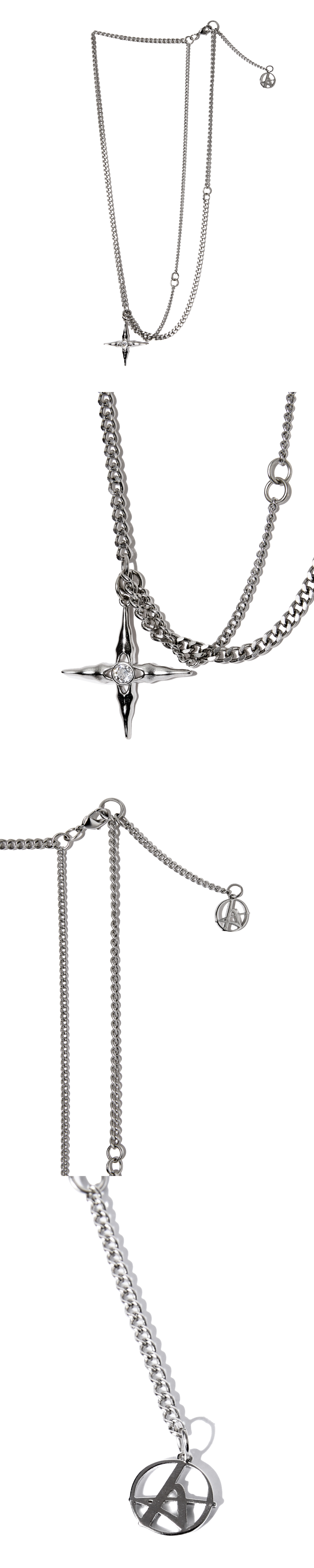 녹아내린 듯한 질감으로 변형된 크로스 펜던트가 돋보이는 네크리스입니다. 체인은 비대칭 구조로 한쪽이 두 줄로 레이어드되어 독창적인 실루엣을 완성합니다. 심플하지만 왜곡된 형태감이 포인트가 되는 아이템입니다. -DETAIL- 몰튼 텍스처 크로스 펜던트 비대칭 레이어드 체인 큐빅 스톤 장식