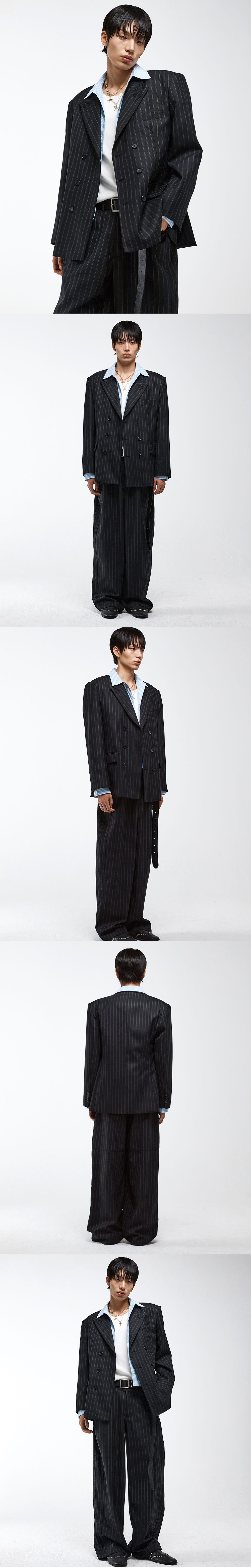 핀스트라이프 원단으로 제작된 더블 브레스티드 자켓입니다. 피크드 라펠과 구조적인 패턴 설계가 어우러져 정제된 실루엣을 완성하며, 클래식한 요소와 현대적인 감각을 동시에 담아냈습니다. 숄더 패드가 내장되어 안정감 있는 어깨선을 연출하고, 포멀한 무드 속에서도 존재감을 드러내는 아이템입니다. -DETAIL- 핀스트라이프 원단 더블 브레스티드 여밈 피크드 라펠 숄더 패드 내장 플랩 포켓 & 가슴 웰트 포켓 리얼 버튼 커프스
