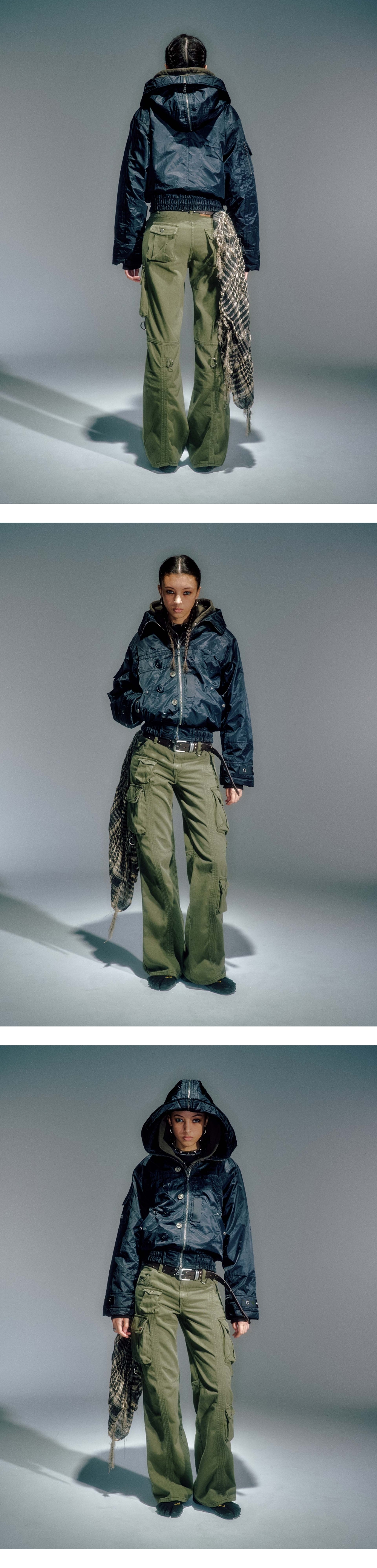 구겨져 보이는 나일론 소재 사용 다양한 룩킹이 가능한 후디 지퍼 디테일 소매 절개 디테일 밀리터리 웨빙 디테일 베이컨트 제작 리벳 사용 빈티지한 올풀림 연출 YKK 2WAY 지퍼 사용 S /M (CM) Length : 58 / 60 Shoulder : 48 / 49 Bust : 56 / 58 Sleeve : 61 / 62 SHELL : NYLON 100% LINING : POLYESTER 48% VISCOSE RAYON 52%