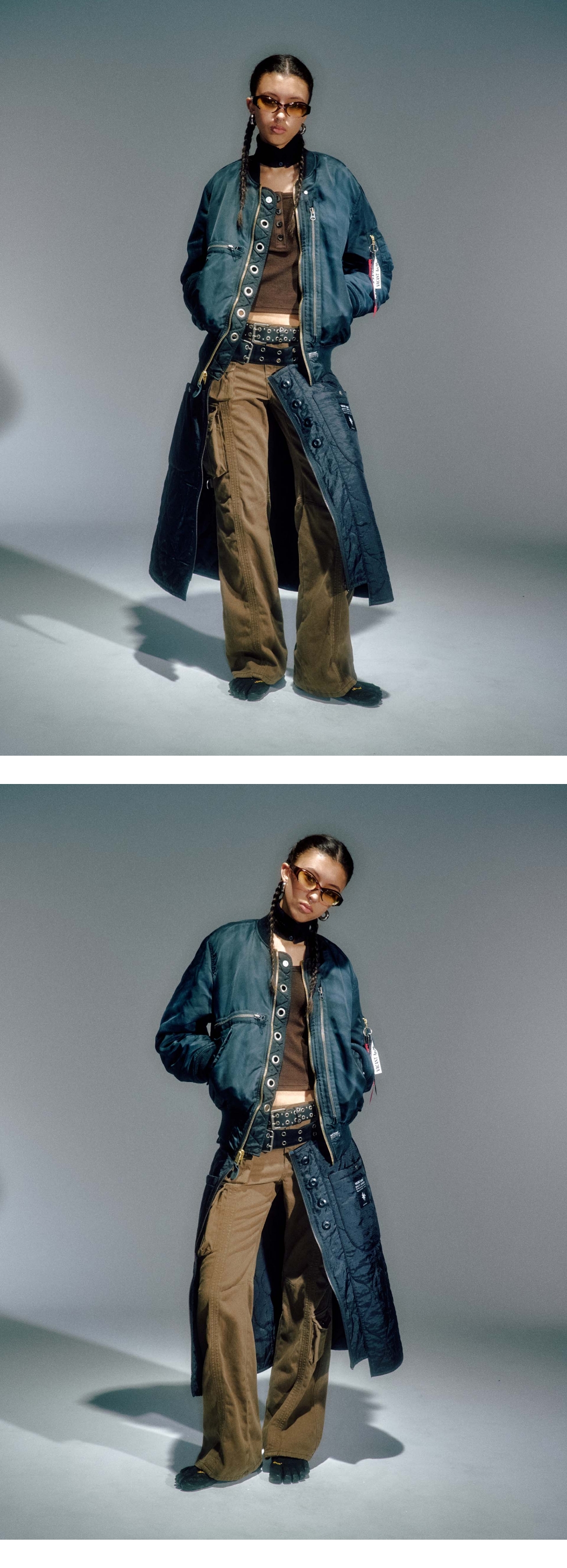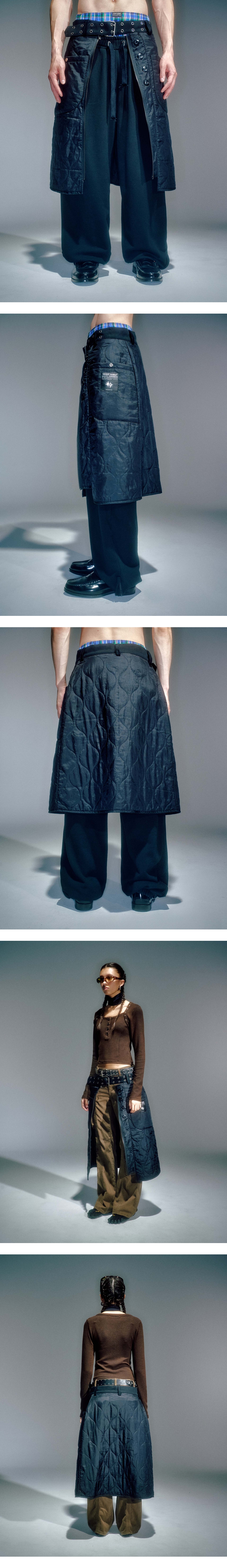 2온스 코튼 솜으로 누빔 처리하여 보온력 높은 레이어드 스커트 벹트 벨트 버클로 허리 사이즈 조절 베이컨트 워크웨어 라벨 디테일 YKK 지퍼 사용 ONESIZE (CM) Length : 71 Waist : 39 Hip : 52 SHELL 1 : NYLON 100% SHELL 2 : COTTON 100% LINING : NYLON 100%