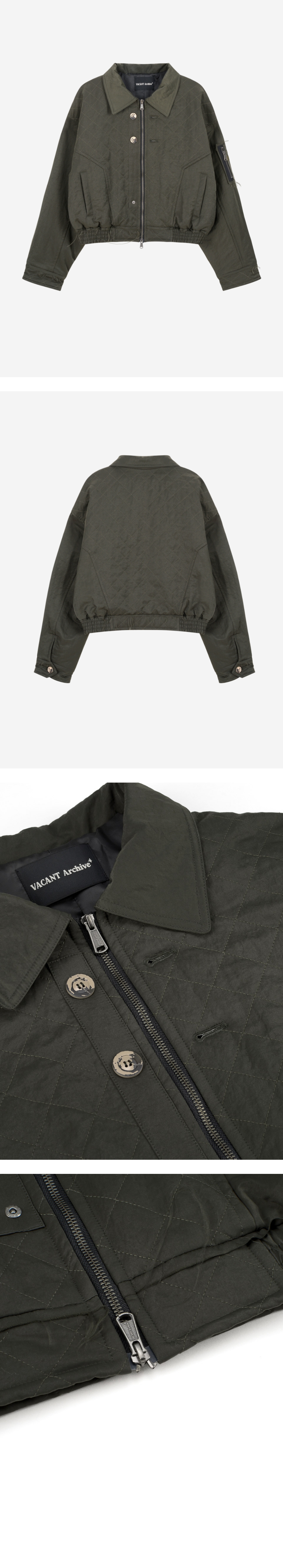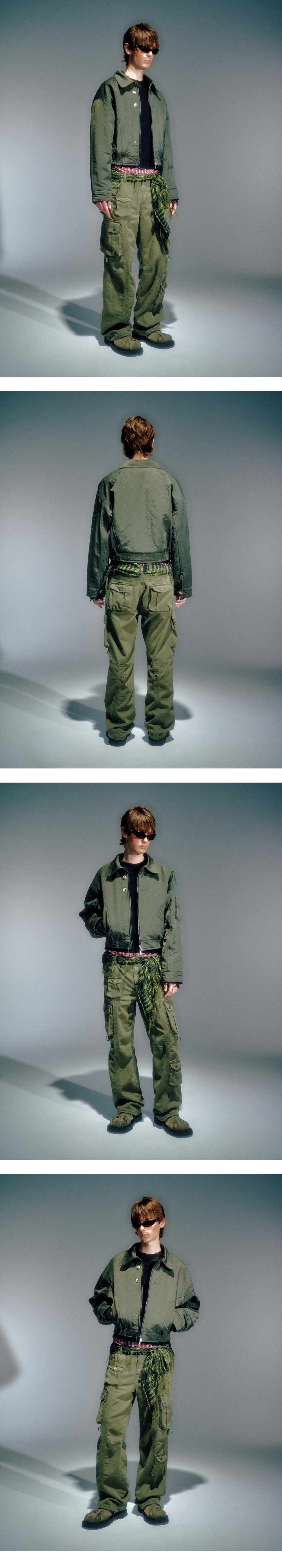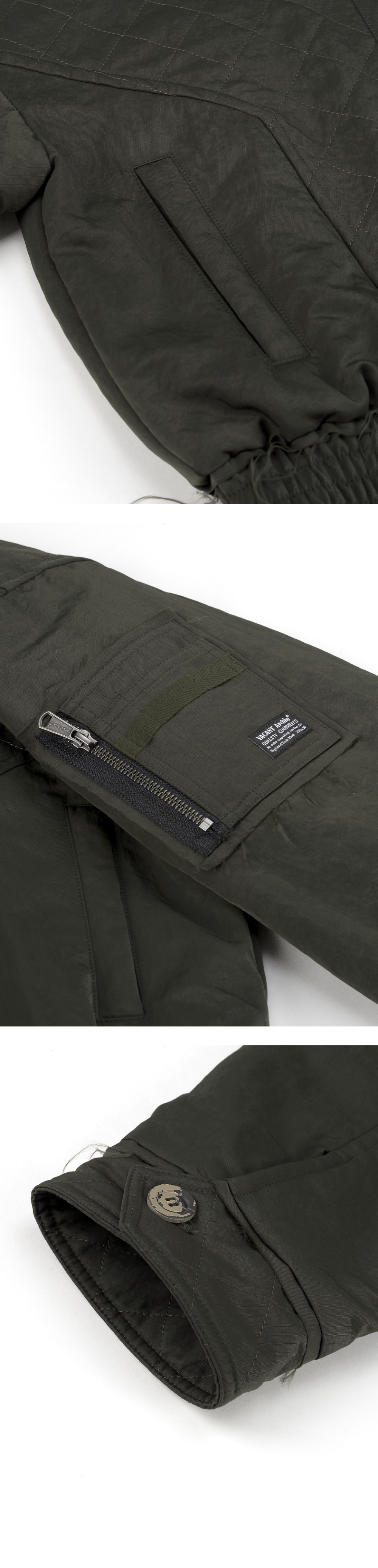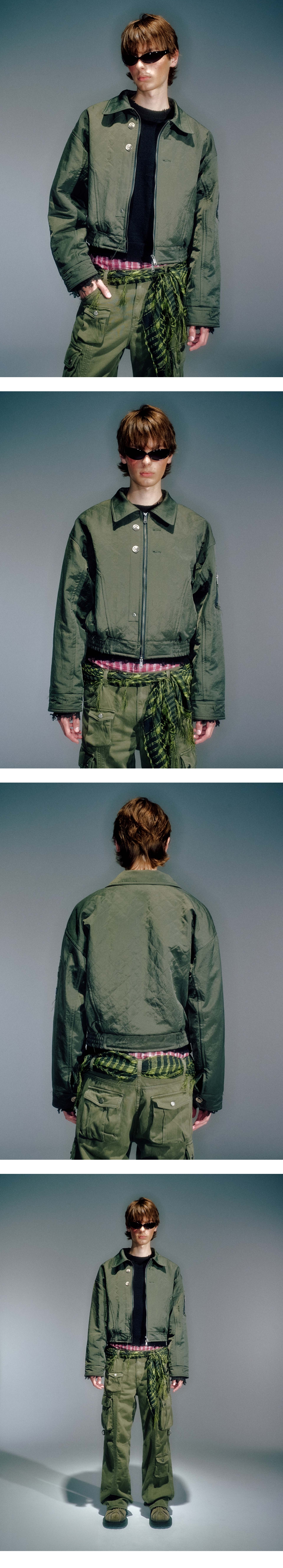 누빔처리 된 헤비트윌 원단 사용한 봄버 스타일의 자켓 리페인트한 빈티지 단추 사용 카라 디테일과 커프스 디테일로 빈티지한 무드 연출 YKK 2WAY 지퍼 사용 L (CM) Length : 58.5 Shoulder : 62 Bust : 60 Sleeve : 60.5 SHELL : NYLON 100% LINING : POLYESTER100% 1. 단독 드라이클리닝 하십시오. 2. 장식 및 고무제 라벨 다림질을 금지합니다. 3. 기계 건조 사용을 금지합니다. 4. 탈착이 불가능한 장식물은 은박지로 싼 후 클리닝 하십시오. 5. 올 뜯김 및 필링에 주의하십시오. 6. 이염 및 변색을 주의하십시오. 7. 가열 제품의 사용을 절대 금합니다. 8. 난방 기구 등 열기 가까이 두지 마십시오. 9. 자수 및 프린트 부분에 마찰이 생기지 않도록 주의하세요. 10. 소비자 부주의로 인한 제품 손상은 보상이 되지 않으므로, 위의 사항을 필히 준수하십시오.