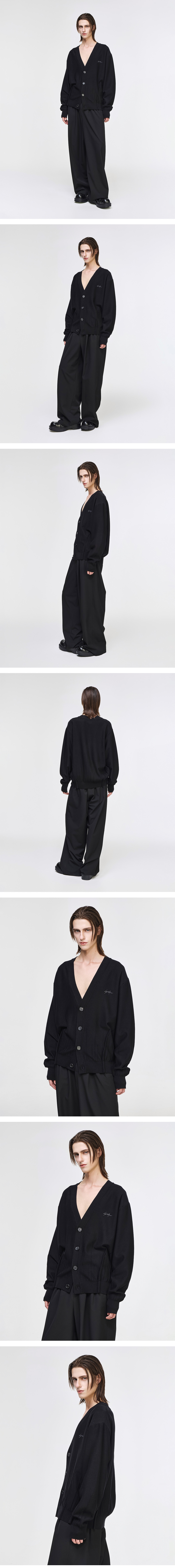 - SONGZIO HOMME 엣지 폴드 포버튼 가디건 - 광택감 있는 울 비스코스 원사 - 12GG도톰한 시그니처 다트 조직 - 전면 'SONGZIO HOMME AUTOGRAPH' 자수 - 전면 후면 엣지 폴드 디테일 - 세미 오버사이즈 실루엣 FABRICATION MADE IN KOREA