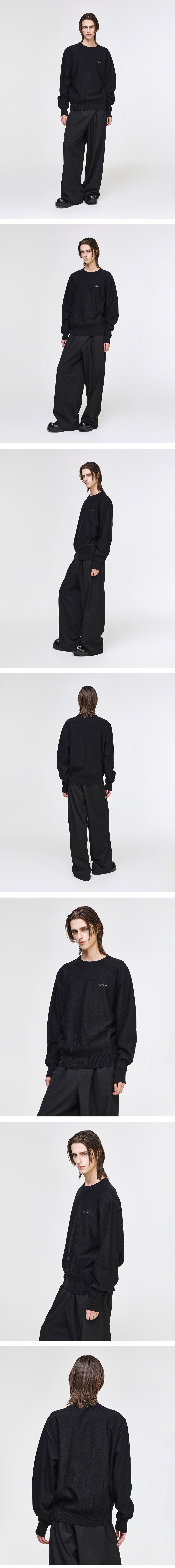 - SONGZIO HOMME 엣지 폴드 크루넥 니트 - 광택감 있는 울 비스코스 원사 - 12GG 시그니처 다트 조직 - 전면 'SONGZIO HOMME AUTOGRAPH' 자수 - 전면 후면 엣지 폴드 디테일 - 세미 오버사이즈 실루엣 FABRICATION MADE IN KOREA
