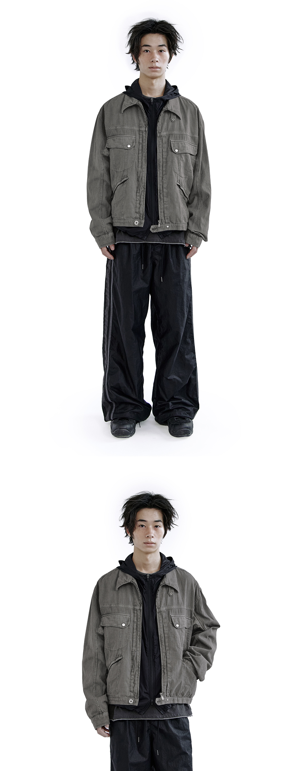 hickory zip trucker (japanese fabric) - striped gray - 은은한 스트라이프가 특징적인 일본산 히코리 원단으로 제작된 지퍼 트러커 - 소매 전 후면의 플로럴 자카드 배색감 - 전면 플리츠 및 절개 디테일 - 2개의 플랩 포켓 & 2개의 사이드 지퍼 포켓 - 샤무드 지퍼 풀러 적용된 사이드 포켓 - 카라 비조 디테일 - 사이드 어드저스터 *모델1: 175cm, 마른 체형 / 3사이즈 착용 *모델2: 170 중반, 마른 체형 / 3사이즈 착용 *디자인 의도에 맞게 착용하시려면 기존 폴리테루 제품과 동일한 사이즈를 선택하시는 것을 권장드립니다. *일반 체형 기준 - 170cm 초반 이하 2사이즈 권장 - 170cm 중반 3사이즈 권장 - 170cm 후반~180cm 초반 4사이즈 권장