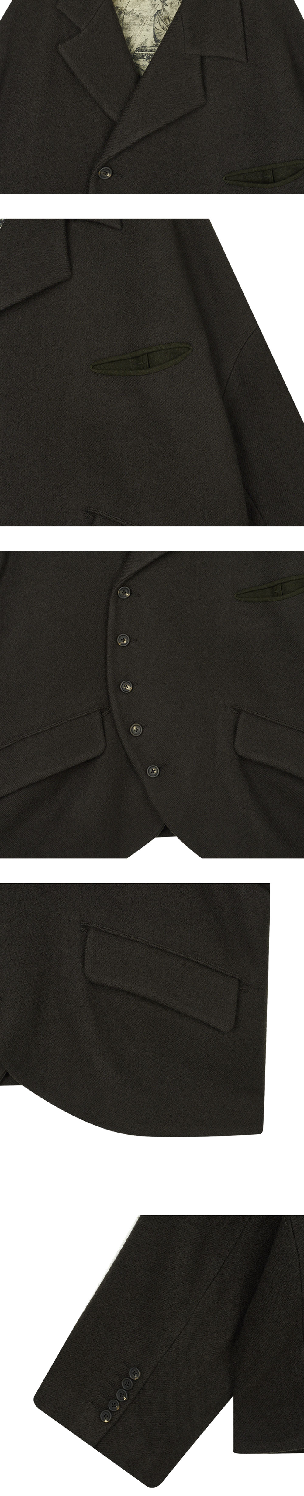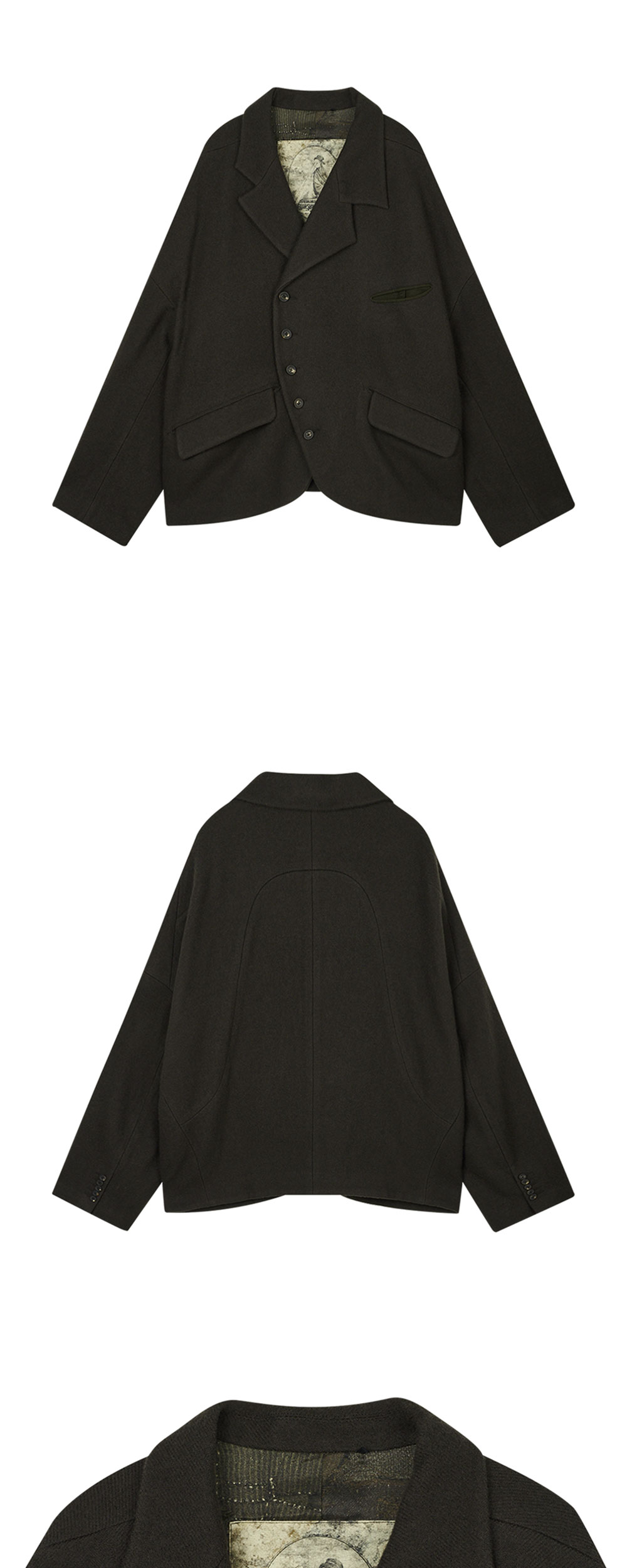 지기첸 어시메트릭 스프레드 칼라 자켓 차콜입니다. - 곡선형 비대칭 싱글브레스티드 자켓 - 오버사이즈 핏 - 하단 양쪽에 플랩 포켓 - 후면 중앙 곡선 절개 라인 - 독특한 패턴의 패브릭이 사용된 안감