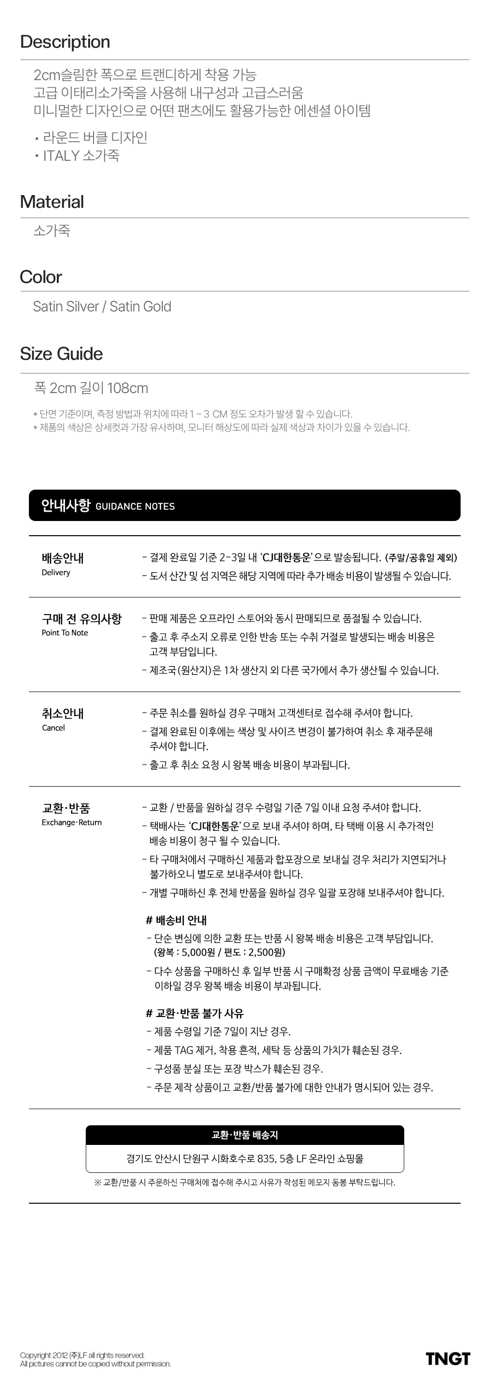 티엔지티 이탈리아 칼프레더 벨트 새틴 실버