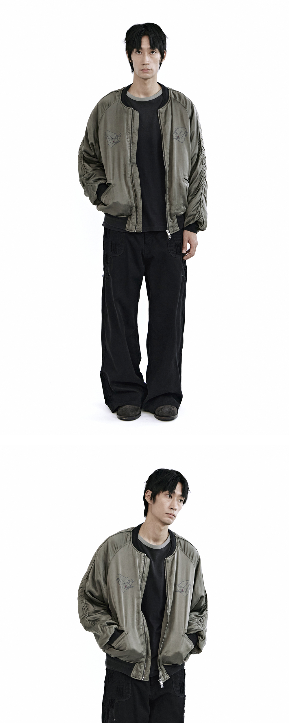 hot stuff x polyteru rayon souvenir jacket - lavender, sage - 전면 옅은 앵그리 핫 스터프 프린팅 - 부드럽고 고급스러운 광택의 레이온 혼방 원단 사용 - 가먼트 다잉 & 워싱으로 완성된 은은한 색감 - 후면 빈티지 레이온 수베니어 베이스로 재해석한 그래픽과 자수 혼용 디테일 - 소매 파이핑을 따라 적용된 셔링 - 자연스러운 사용감을 구현한 소매 & 밑단 립 - 내부 다이아몬드 퀼팅 및 2개의 스냅 버튼 - YKK 투웨이 지퍼 클로징 - 간절기 착용에 적합한 두께감 *모델: 170 중반 / 마른 체형, 3사이즈 착용