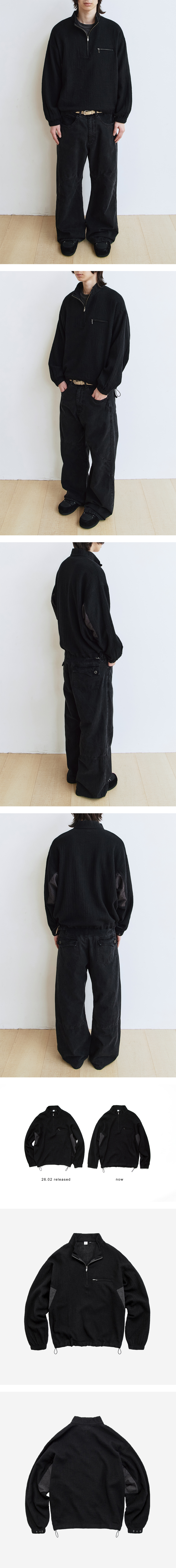 boiled wool half zip (paisley patched) - black - 축용 가공한 울 패브릭 특유의 실루엣이 특징적인 하프 집 - 매우 가벼우며, 흐르는 듯한 착용감 - 사이드 & 뒷소매 페이즐리 배색감 - 지퍼를 풀고 연출할 시, 축융 울 특유의 곡선감 표현 가능 - 1개의 프론트 포켓 - 폴리테루 별주 풀러 적용된 YKK 지퍼 - 밑단 스트링으로 레이어링에 용이 - 소매 버튼으로 실루엣 조절 가능 * 직전 차수 대비 어깨, 품, 총장이 보다 여유 있게 완성되었습니다. *모델: 178cm / 마른 체형, 3사이즈 착용 * 금번 차수는 직전 차수 대비, 치수감이 여유롭게 완성되었습니다. 정확한 상세 사이즈의 경우, 실측표 확인 부탁드립니다. * 직전 차수 대비, 유사한 컬러감으로 제작되었습니다. 자세한 사항은 상세 이미지 참고 부탁드립니다.