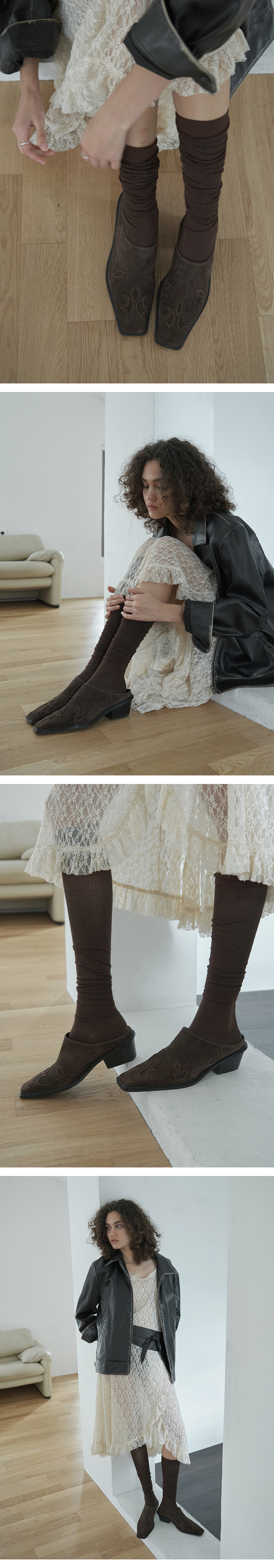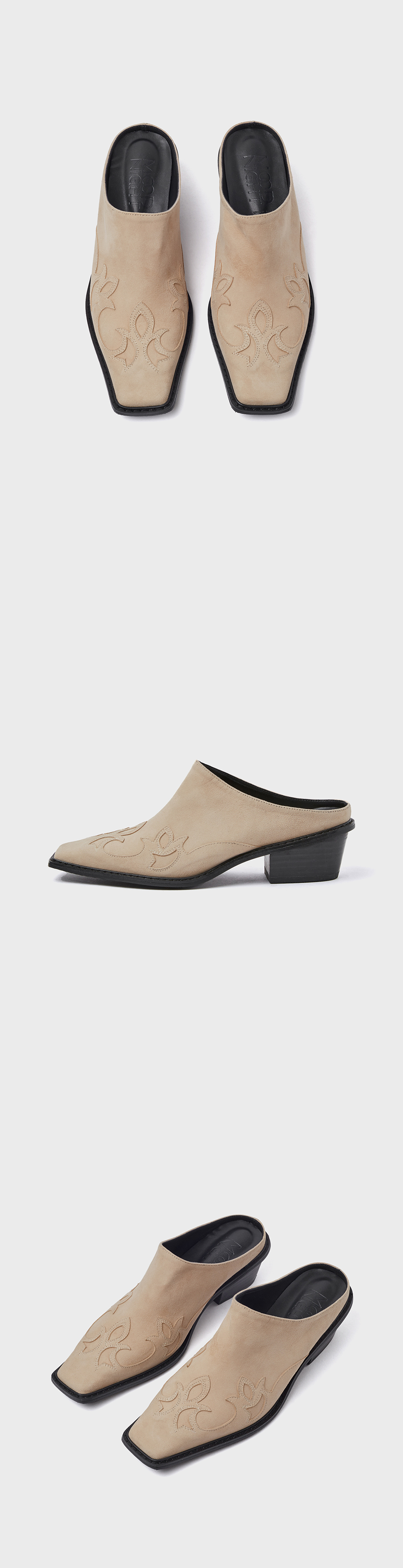 · 앞체를 납작하게 샌딩한 스퀘어에 볼드 아웃솔로 존재감 있는 쉐입 · 웨스턴 무드의 카운터 장식으로 과하지 않은 포인트 · 볼드한 우드 소재의 웨스턴 미들힐 · 푹신한 라텍스 인솔(in-sole)로 장시간 착화에도 피로가 덜한 착화감