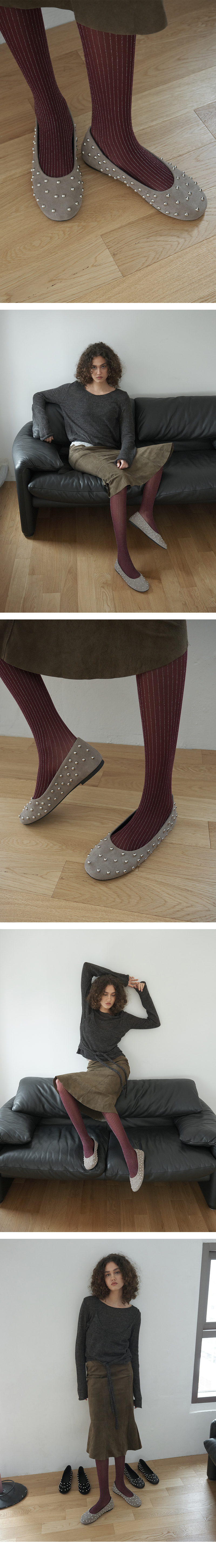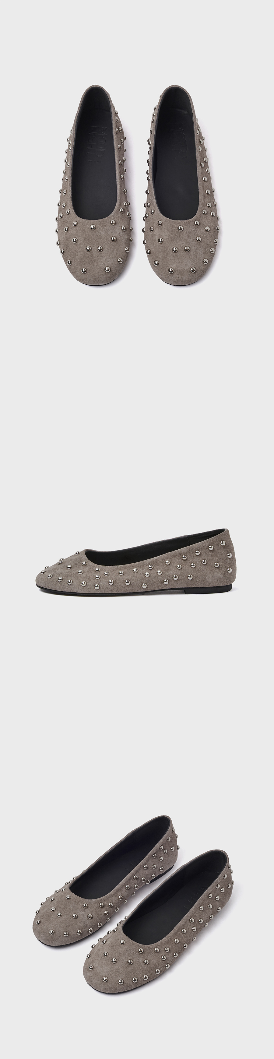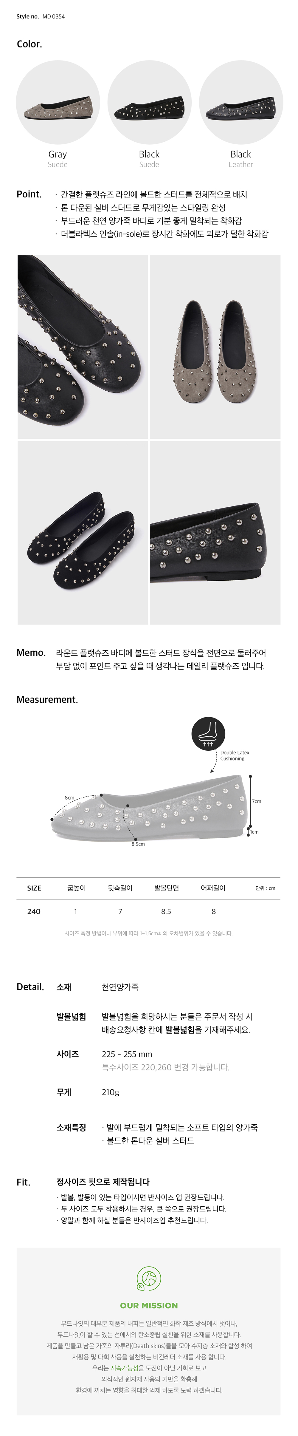 · 간결한 플랫슈즈 라인에 볼드한 스터드를 전체적으로 배치 · 톤 다운된 실버 스터드로 무게감있는 스타일링 완성 · 부드러운 천연 양가죽 바디로 기분 좋게 밀착되는 착화감 · 더블 라텍스 인솔(in-sole)로 장시간 착화에도 피로가 덜한 착화감