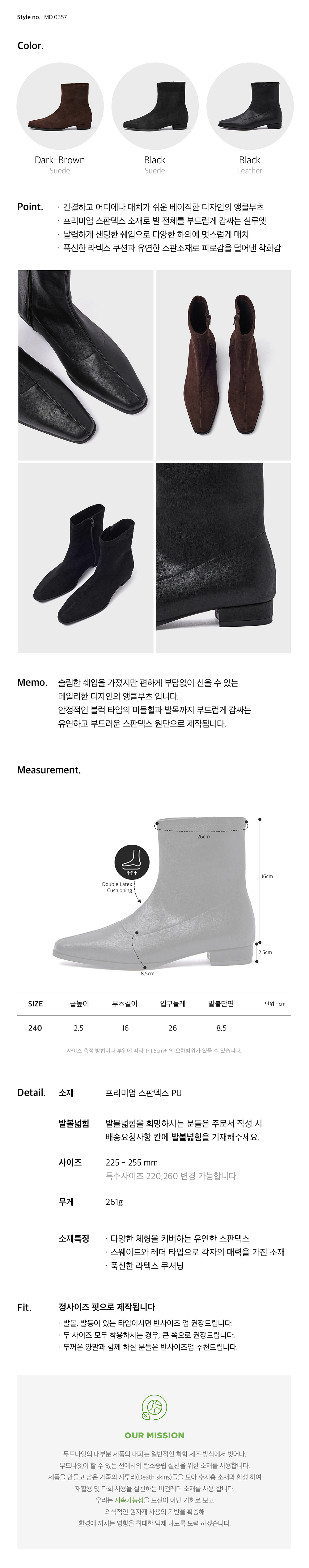 · 간결하고 어디에나 매치가 쉬운 베이직한 디자인의 앵클부츠 · 프리미엄 스판덱스 소재로 발 전체를 부드럽게 감싸는 실루엣 · 날렵하게 샌딩한 쉐입으로 다양한 하의에 멋스럽게 매치 · 푹신한 라텍스 쿠션과 유연한 스판소재로 피로감을 덜어낸 착화감