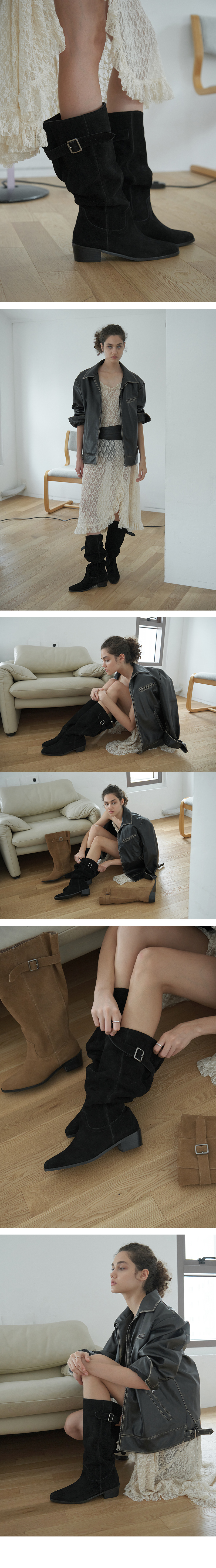 · 천연 스웨이드 특유의 빈티지함을 가득 담은 웨스턴 부츠 · 입구 라인을 여유있게 재단해 벨트와 함께 자연스러운 셔링 연출 · 안정감 있는 웨스턴 무드의 미들힐 타입 · 푹신한 라텍스 인솔(in-sole)로 피로감을 덜어낸 착화감