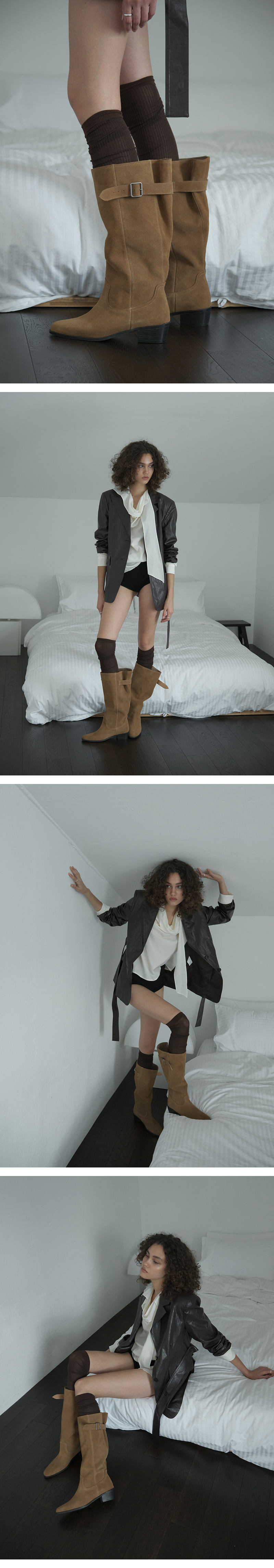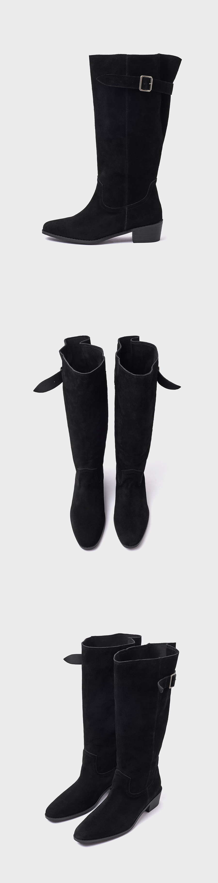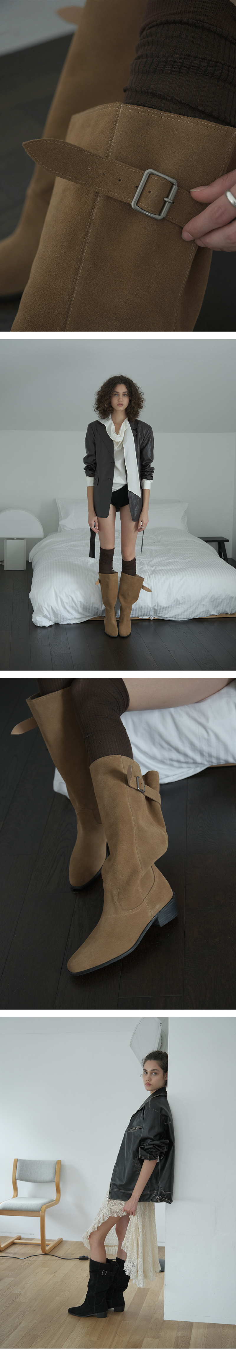 · 천연 스웨이드 특유의 빈티지함을 가득 담은 웨스턴 부츠 · 입구 라인을 여유있게 재단해 벨트와 함께 자연스러운 셔링 연출 · 안정감 있는 웨스턴 무드의 미들힐 타입 · 푹신한 라텍스 인솔(in-sole)로 피로감을 덜어낸 착화감