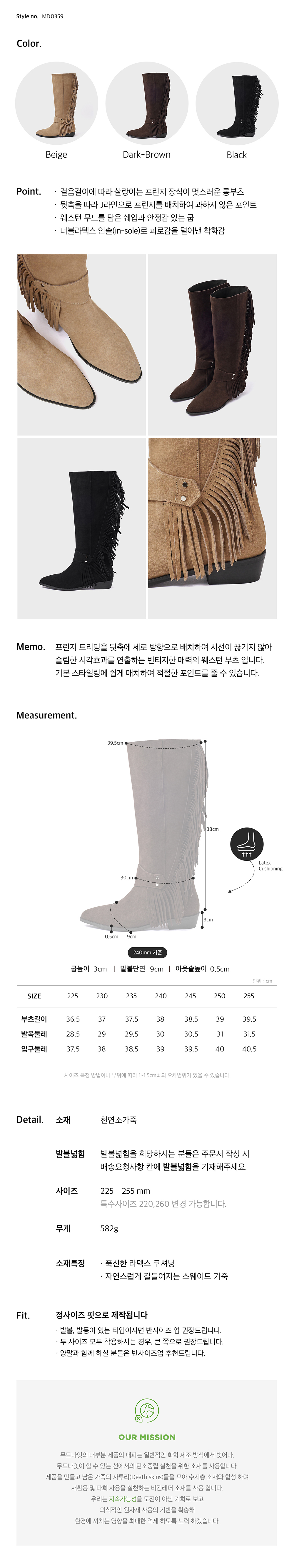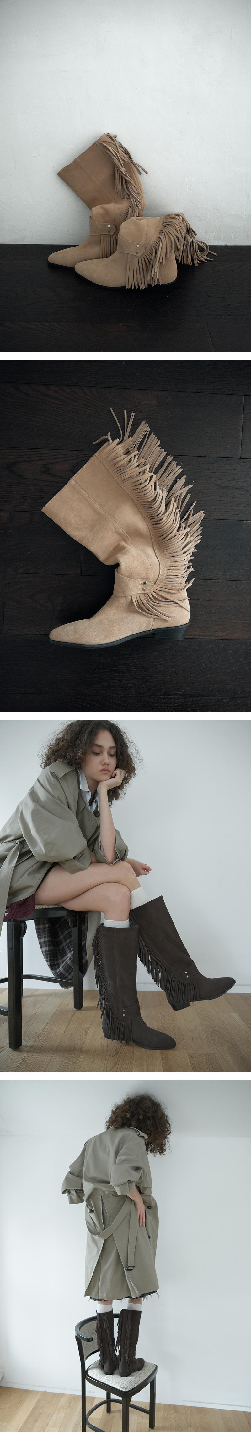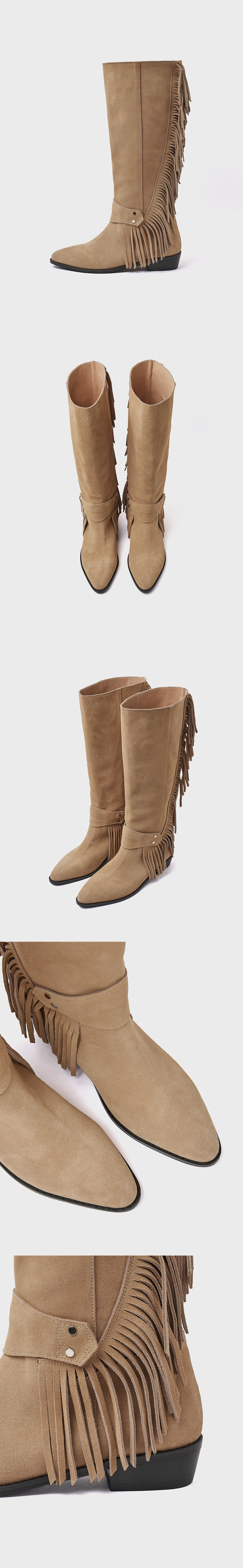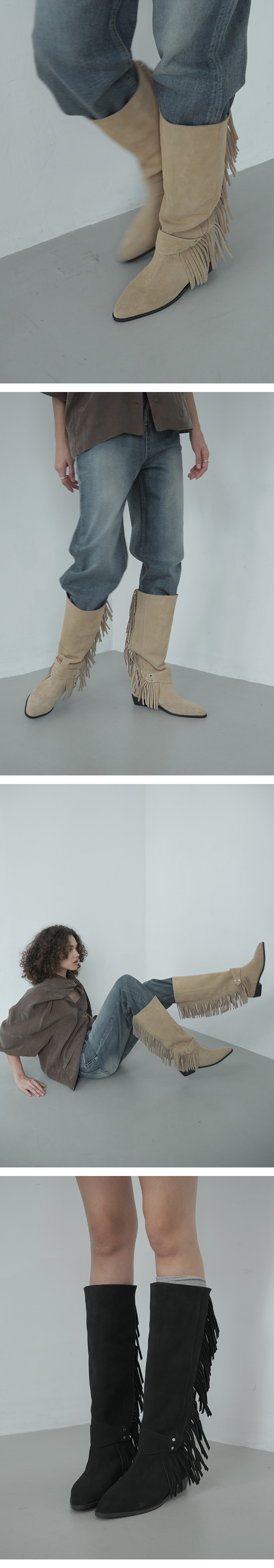 · 걸음걸이에 따라 살랑이는 프린지 장식이 멋스러운 롱부츠 · 뒷축을 따라 J라인으로 프린지를 배치하여 과하지 않은 포인트 · 웨스턴 무드를 담은 쉐입과 안정감 있는 굽 · 더블라텍스 인솔(in-sole)로 피로감을 덜어낸 착화감